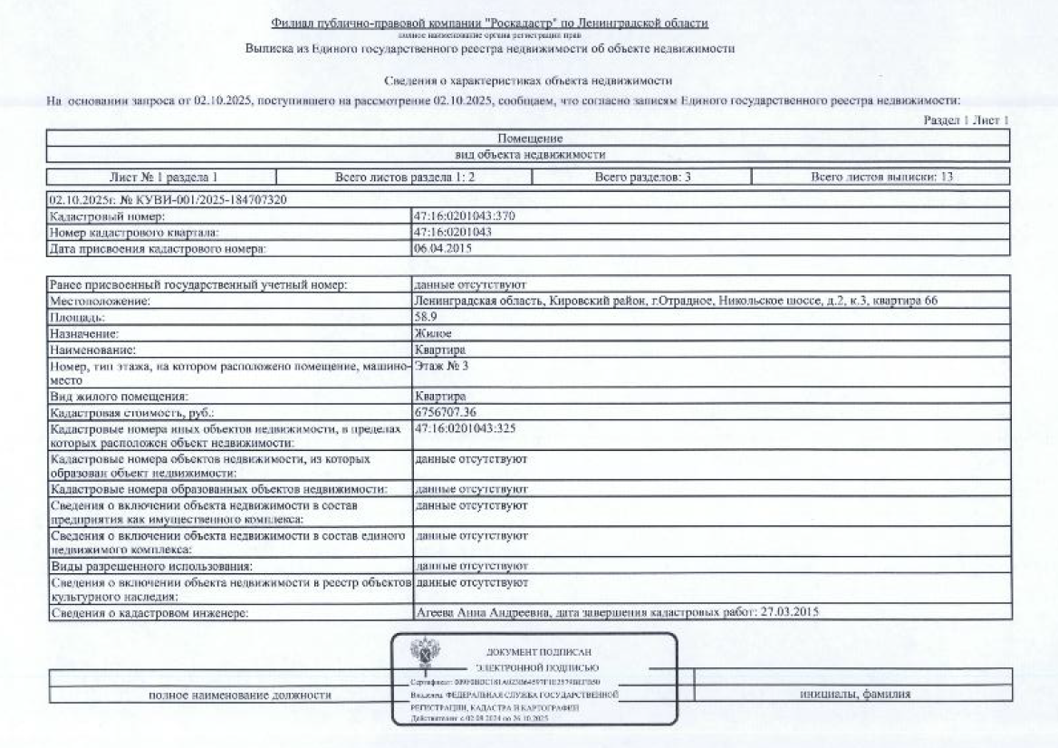квартира общ.пл.58,9 кв.м. кадастровый № 47:16:0201043:370, расположенная по адресу: ЛО, Кировский район, г. Отрадное, Никольское шоссе, д. 2, корп.3, кв. 66