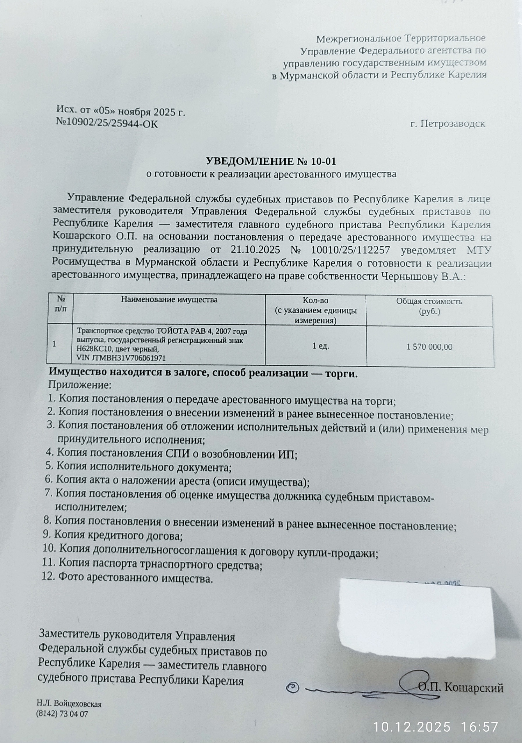 Автомобиль легковой TOYOTA RAV4, 2007 г. в.; г/н H628KC10; VIN JTMBH31V706061971; номер кузова (прицепа) JTMBH31V706061971, номер двигателя 5675302, объем двигателя 1998.000, мощность 111800, л. с. 152.000, цвет – черный, б/у, расположенный по адресу: РК, Лоухский район, п. Чупа, ул. Сосновый бор, д. 11, имущество на работоспособность не проверялось. Находится в залоге.