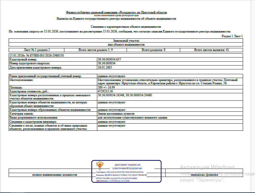 Земельный участок общей площадью 589 кв. м, кадастровый номер 38:36:000034:637, категория земель - населенных пунктов, вид разрешенного использования - для эксплуатации существующего нежилого здания, местоположение: г. Иркутск, Кировский р-н, ул. Степана Разина, 38 (на земельном участке находится здание, подлежащее сносу по постановлению Четвертого Арбитражного апелляционного суда от 10 апреля 2025 г.).