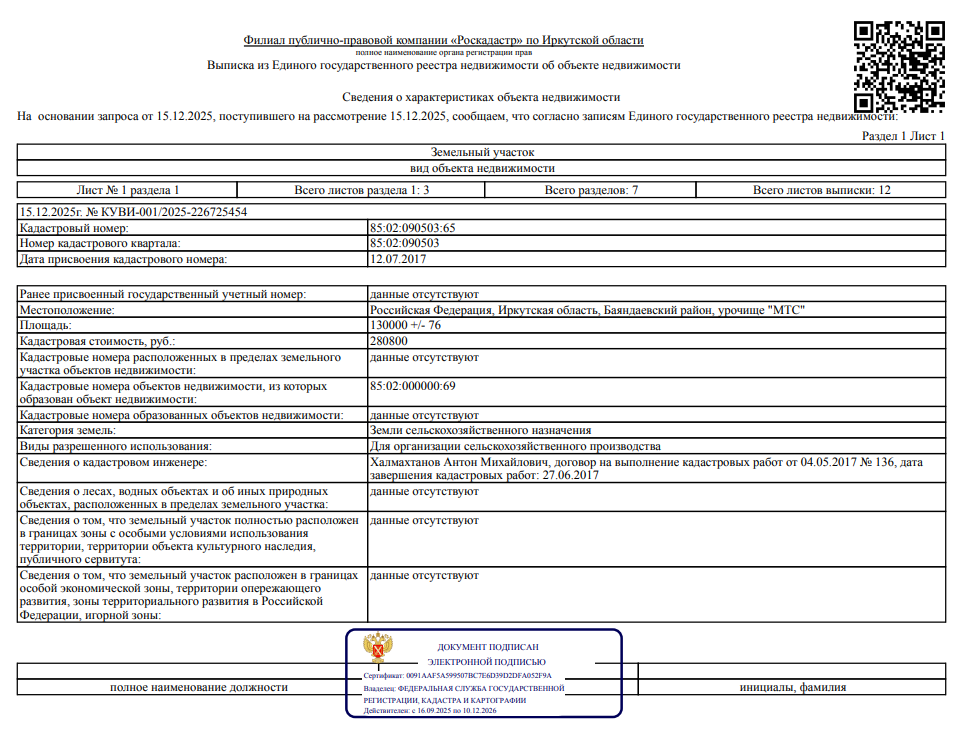 Земельный участок общей площадью 130000 кв. м, кадастровый номер 85:02:090503:65, категория земель - земли сельскохозяйственного назначения, вид разрешенного использования - для организации сельскохозяйственного производства, местоположение: Иркутская обл., Баяндаевский р-н, урочище «МТС».