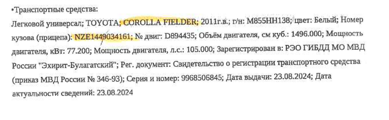Автотранспортное средство Toyota Corolla Fielder, 2011 года выпуска, номер кузова (прицепа) NZE1449034161