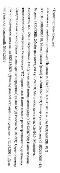Автотранспортное средство UAZ Patriot, 2013 года выпуска, идентификационный номер (VIN) XTT316300E0001418.