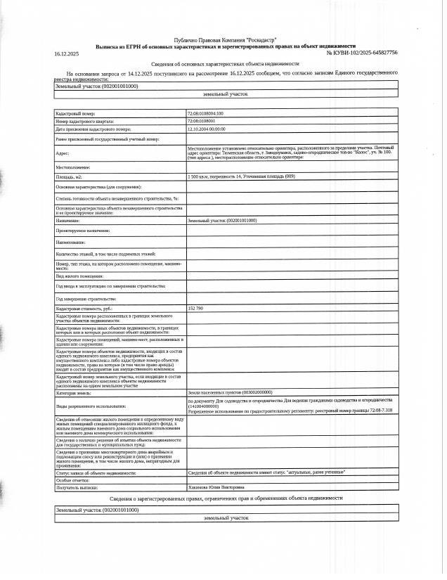 Земельный участок, площадь 1500 кв.м., кадастровый номер: 72:08:0108004:100, г. Заводоуковск, тер. СОТ Колос, уч.100, рег.№ 72-010720(26);