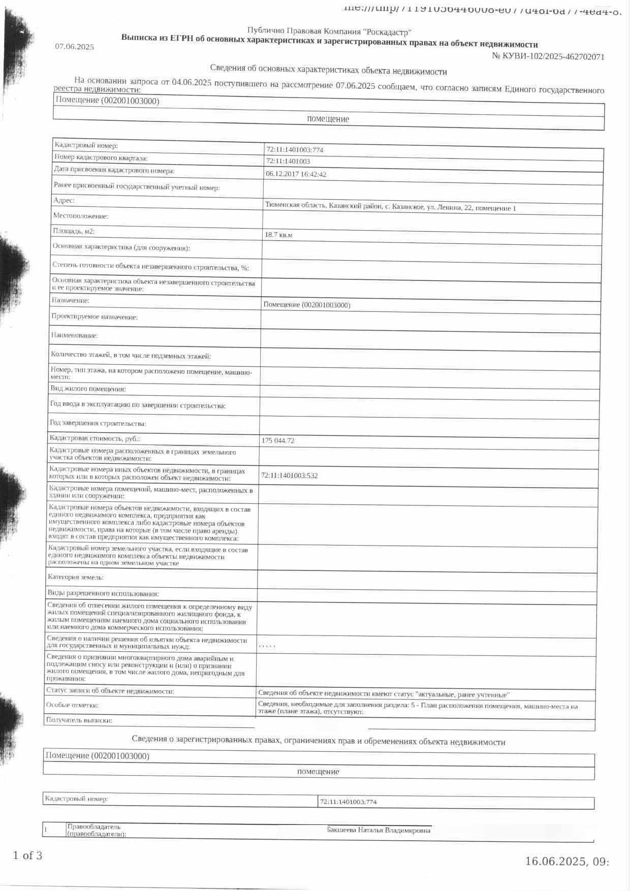 Должник: ИП Бакшеева Н.В., собственник: Бакшеева Н.В. Лот: Нежилое помещение, площадь 18,7 кв. м., кадастровый номер: 72:11:1401003:774, Казанский район, с. Казанское, ул. Ленина, 22, помещение 1, н/ц: 159970 р., з-к: 23996 р., код: 0001, рег.№ 72-010438;
