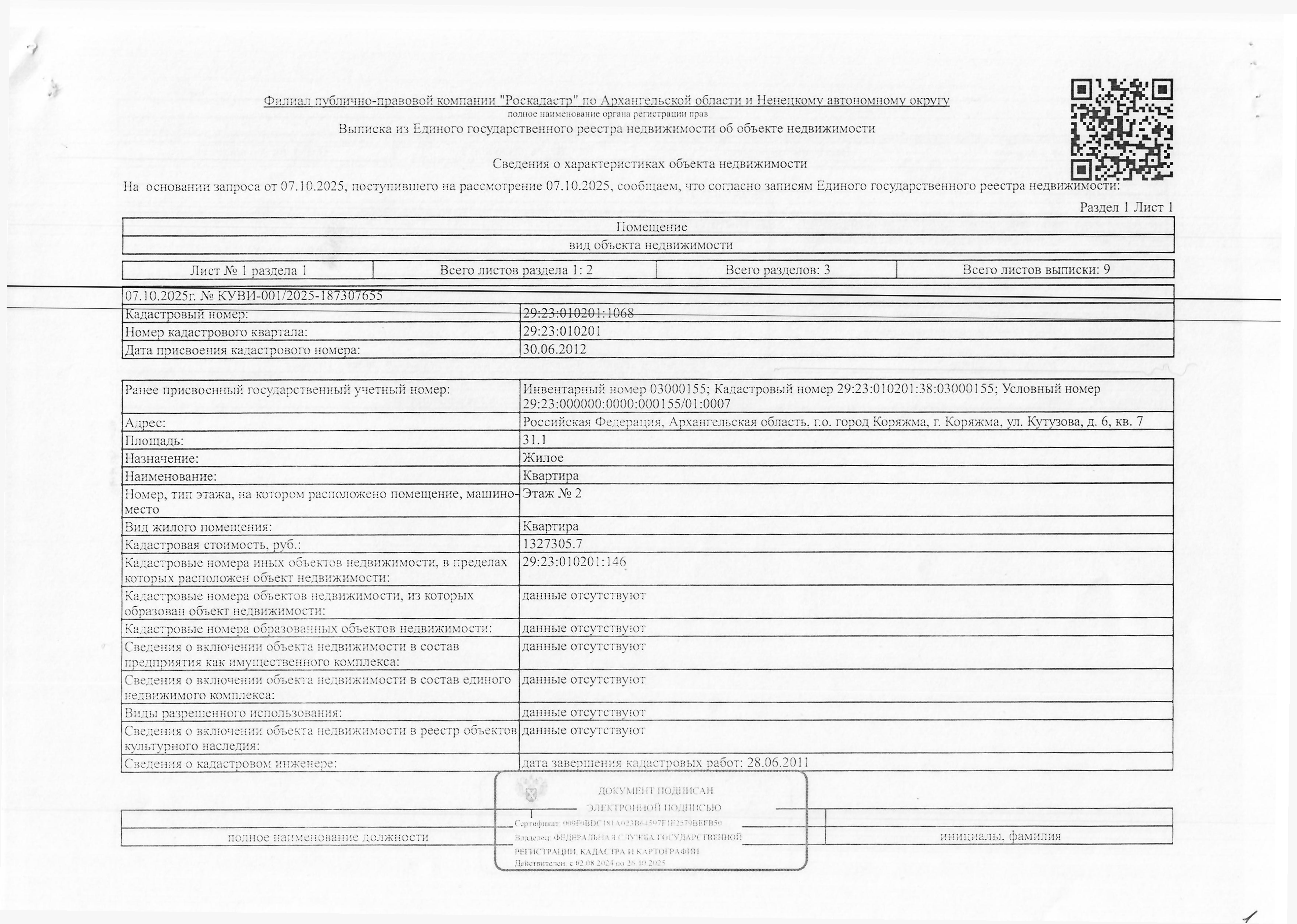 1/3 доля в праве общей долевой собственности на жилое помещение (квартиру) общей площадью 31,1 кв.м, кадастровый номер 29:23:010201:1068. Мстонахождение: Архангельская обл., г. Коряжма, ул. Кутузова, д. 6, кв. 7