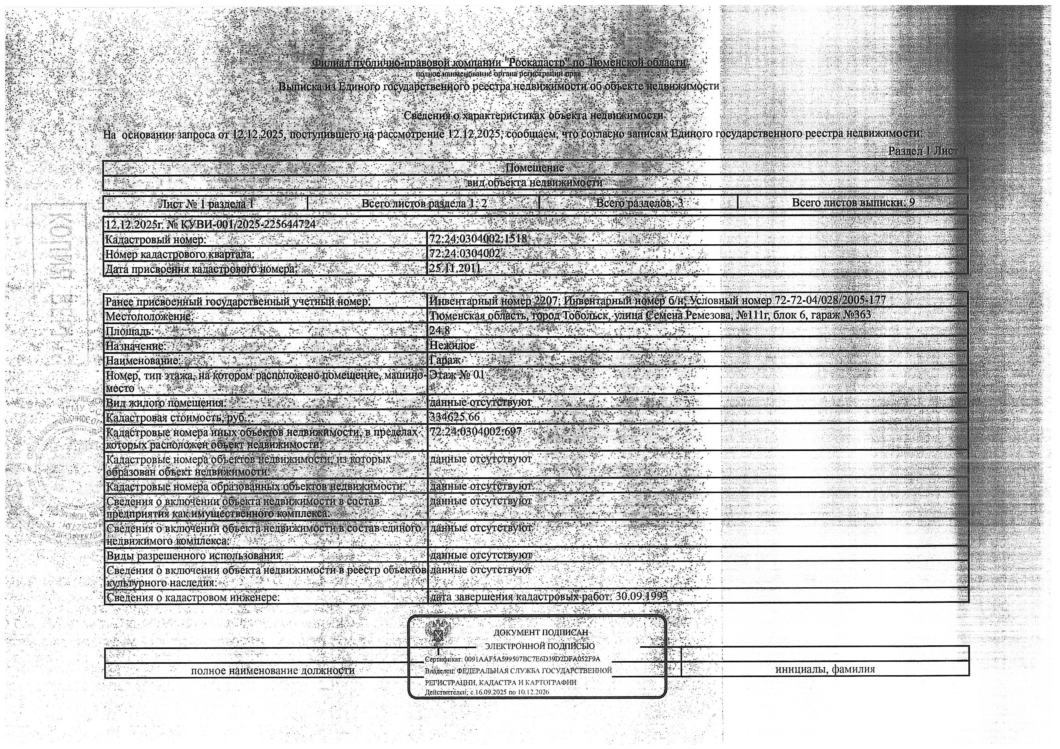 Нежилое помещение (гараж), площадь 24,8 кв.м., кадастровый номер: 72:24:0304002:1518, г. Тобольск, ул. Семена Ремезова, №111г, блок 6, гараж 363, рег.№ 72-011125-ГМУ;
