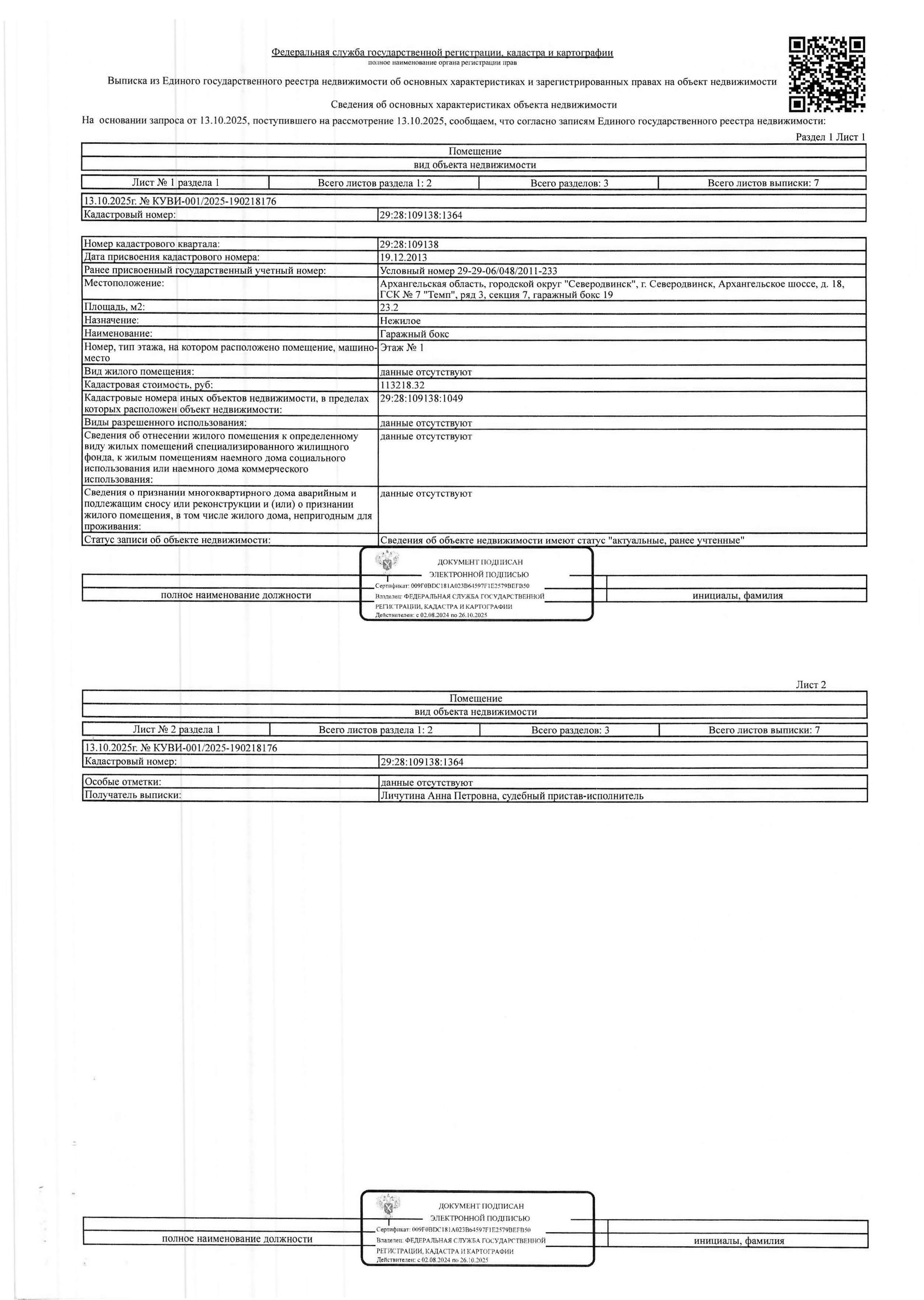 Нежилое помещение (гаражный бокс) общей площадью 23,2 кв.м, кадастровый номер 29:28:109138:1364. Местонахождение: Архангельская обл., г. Северодвинск, Архангельское шоссе, д. 18, ГСК № 7 "Темп", ряд 3, секция 7, гаражный бокс 19