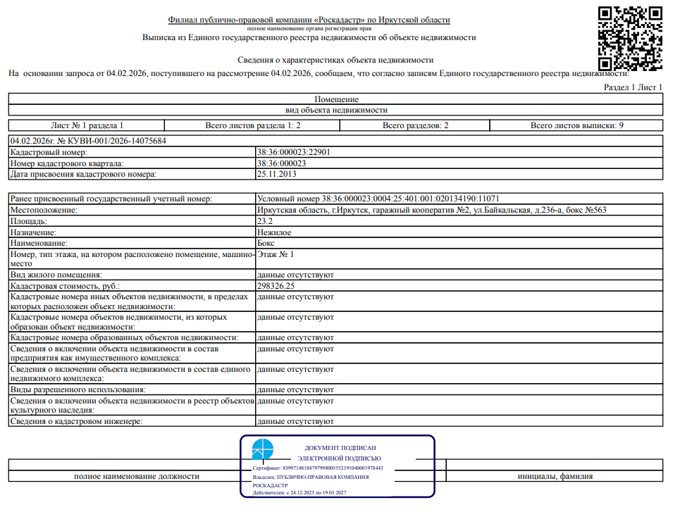 Нежилое помещение площадью 23,2 кв.м, кадастровый номер 38:36:000023:22901, местоположение: г. Иркутск, ул. Байкальская, д. 236а, гаражный кооператив № 2, бокс № 563.