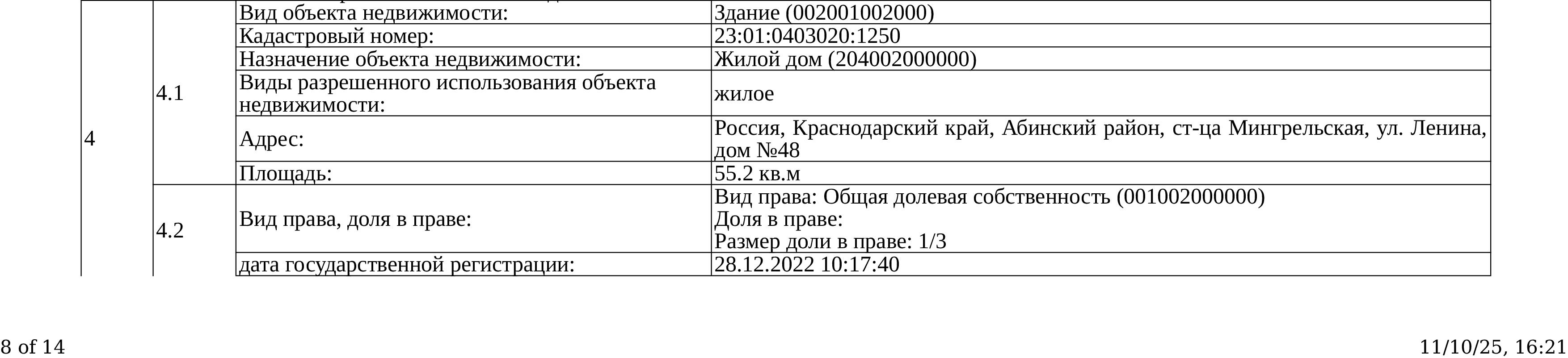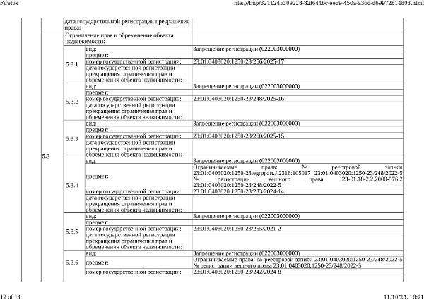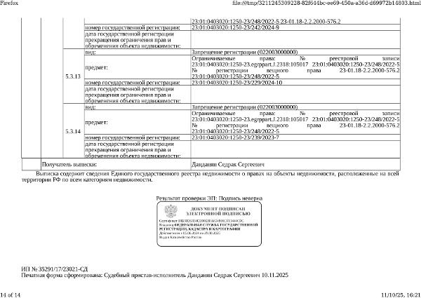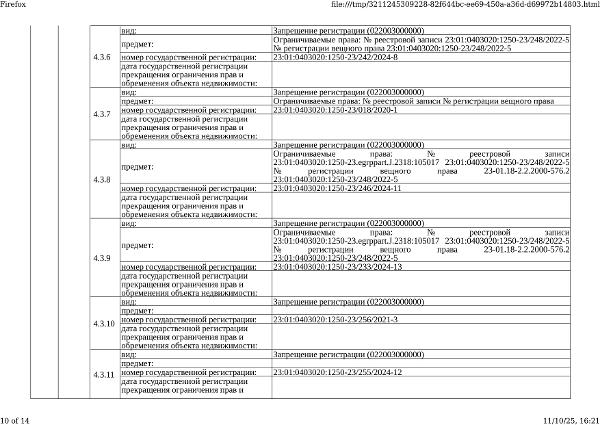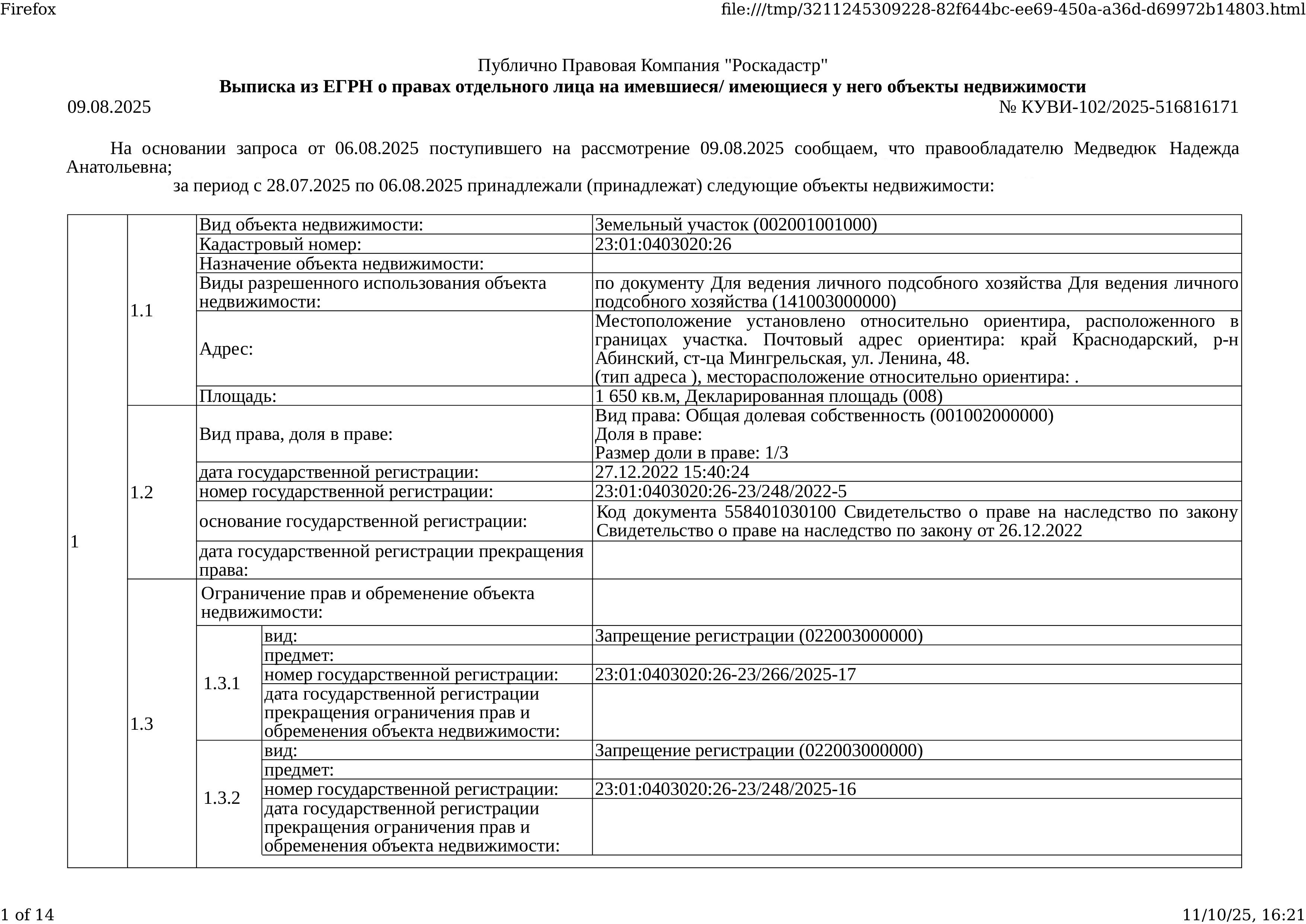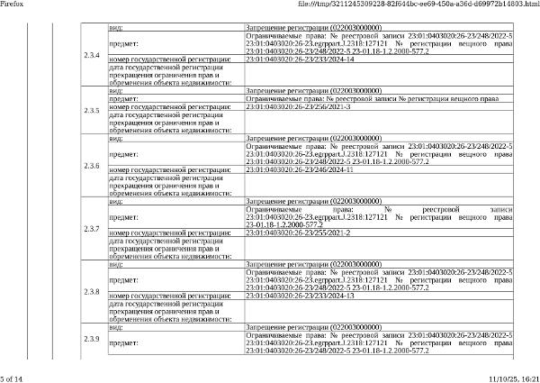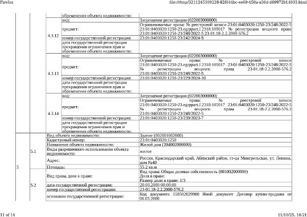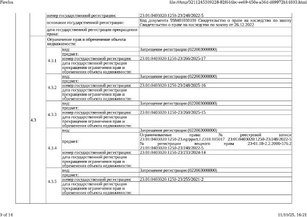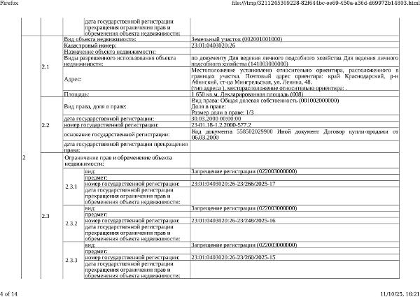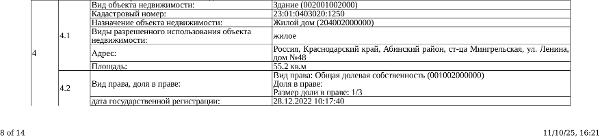 Д-к: Медведюк Н.А. 1/3 доли в праве здания, площадь 55,2 кв.м., кадастровый номер 23:01:0403020:1250. 1/3 доли в праве земельного участка (для ведения личного подсобного хозяйства), площадь 1650 кв.м., кадастровый номер 23:01:0403020:26. Границы земельного участка не установлены в соответствии с требованиями земельного законодательства. Адрес: Краснодарский край, Абинский район, ст.Мингрельская, ул. Ленина, 48. Начальная цена 923 780 руб., задаток 138 567 руб., шаг аукциона 9 238 руб., ув. 1480