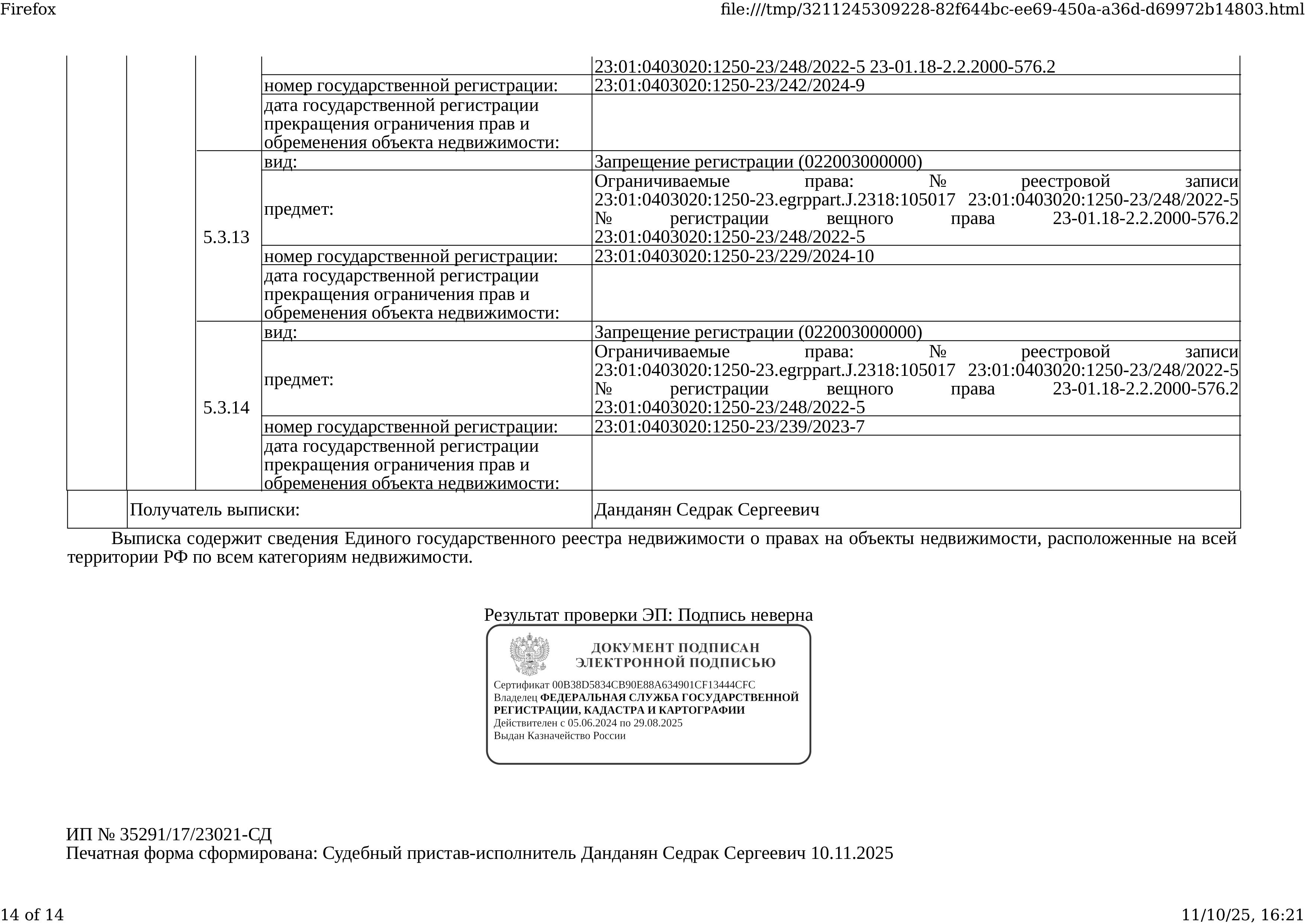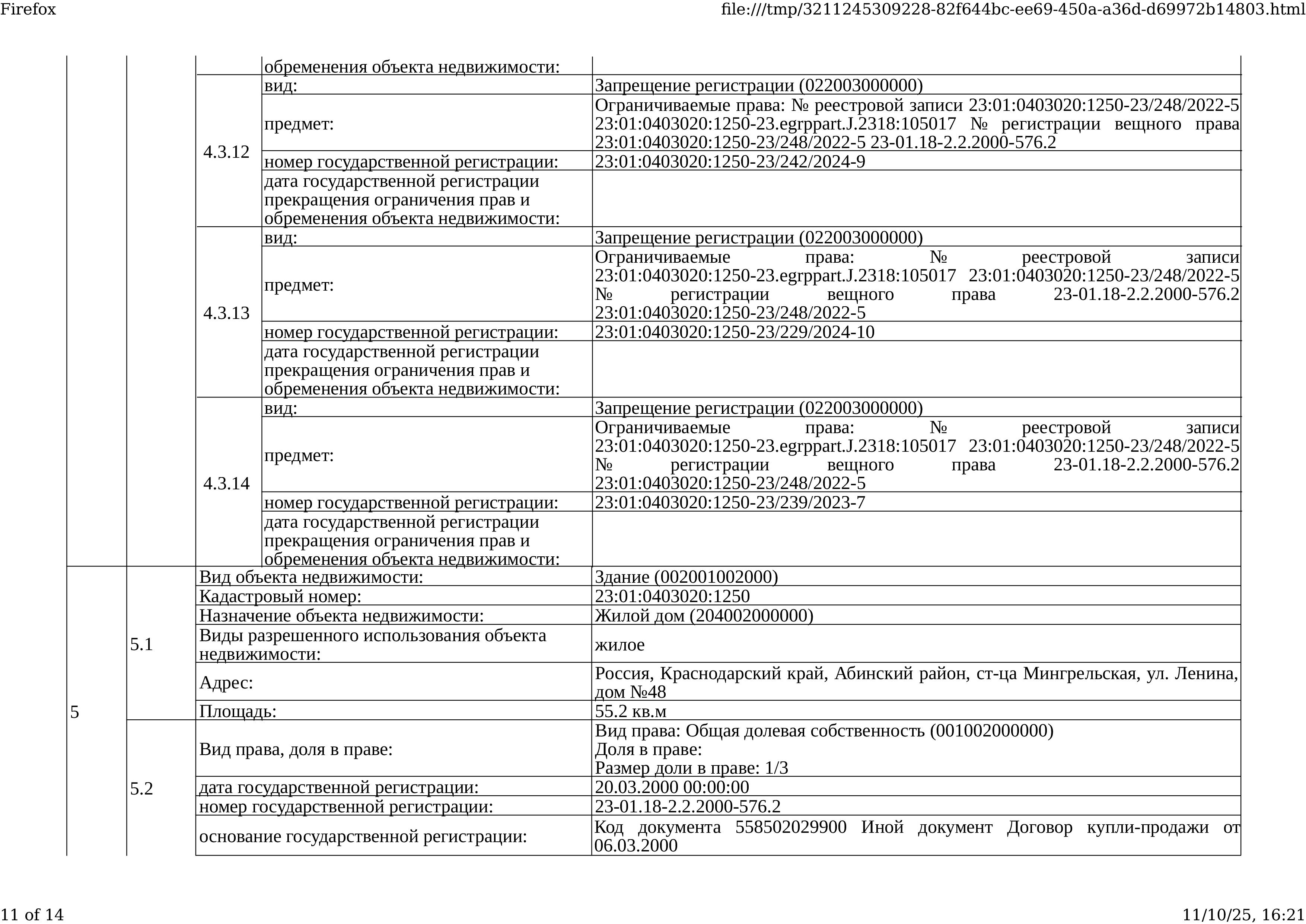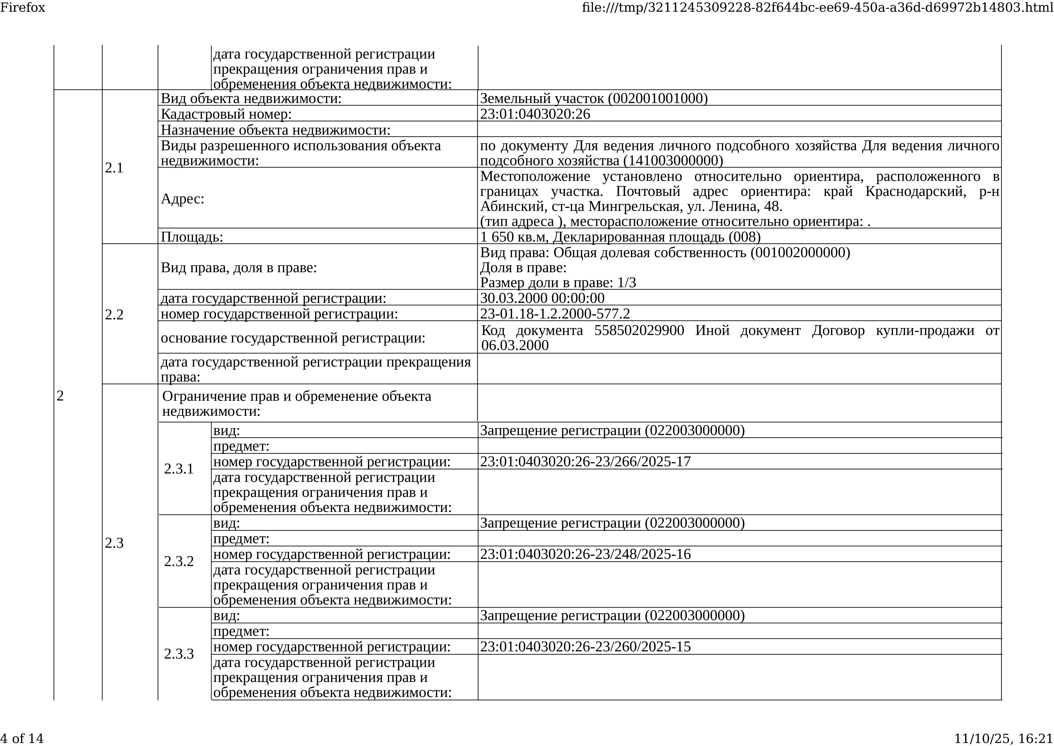 Д-к: Медведюк Н.А. 1/3 доли в праве здания, площадь 55,2 кв.м., кадастровый номер 23:01:0403020:1250. 1/3 доли в праве земельного участка (для ведения личного подсобного хозяйства), площадь 1650 кв.м., кадастровый номер 23:01:0403020:26. Границы земельного участка не установлены в соответствии с требованиями земельного законодательства. Адрес: Краснодарский край, Абинский район, ст.Мингрельская, ул. Ленина, 48. Начальная цена 923 780 руб., задаток 138 567 руб., шаг аукциона 9 238 руб., ув. 1480