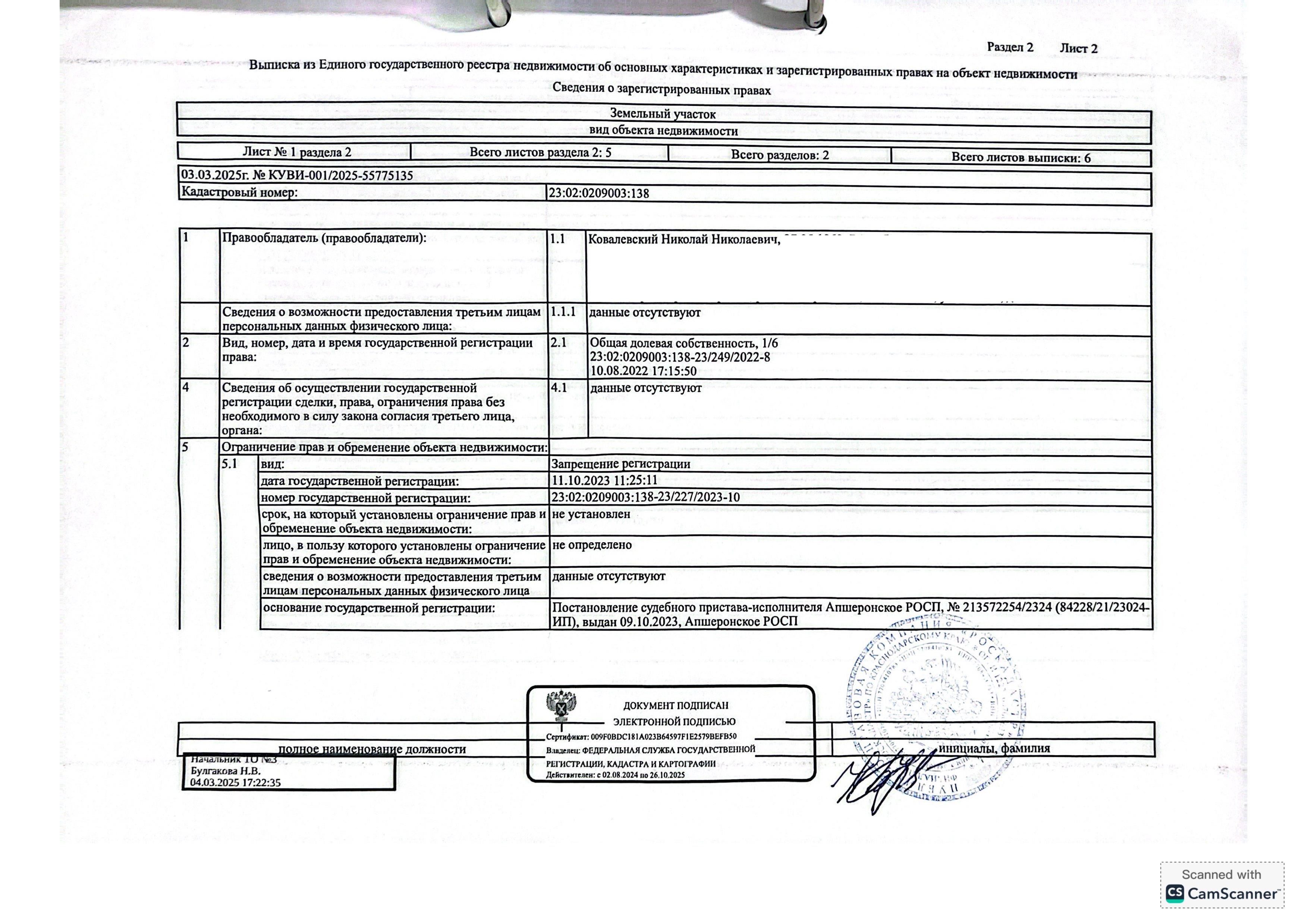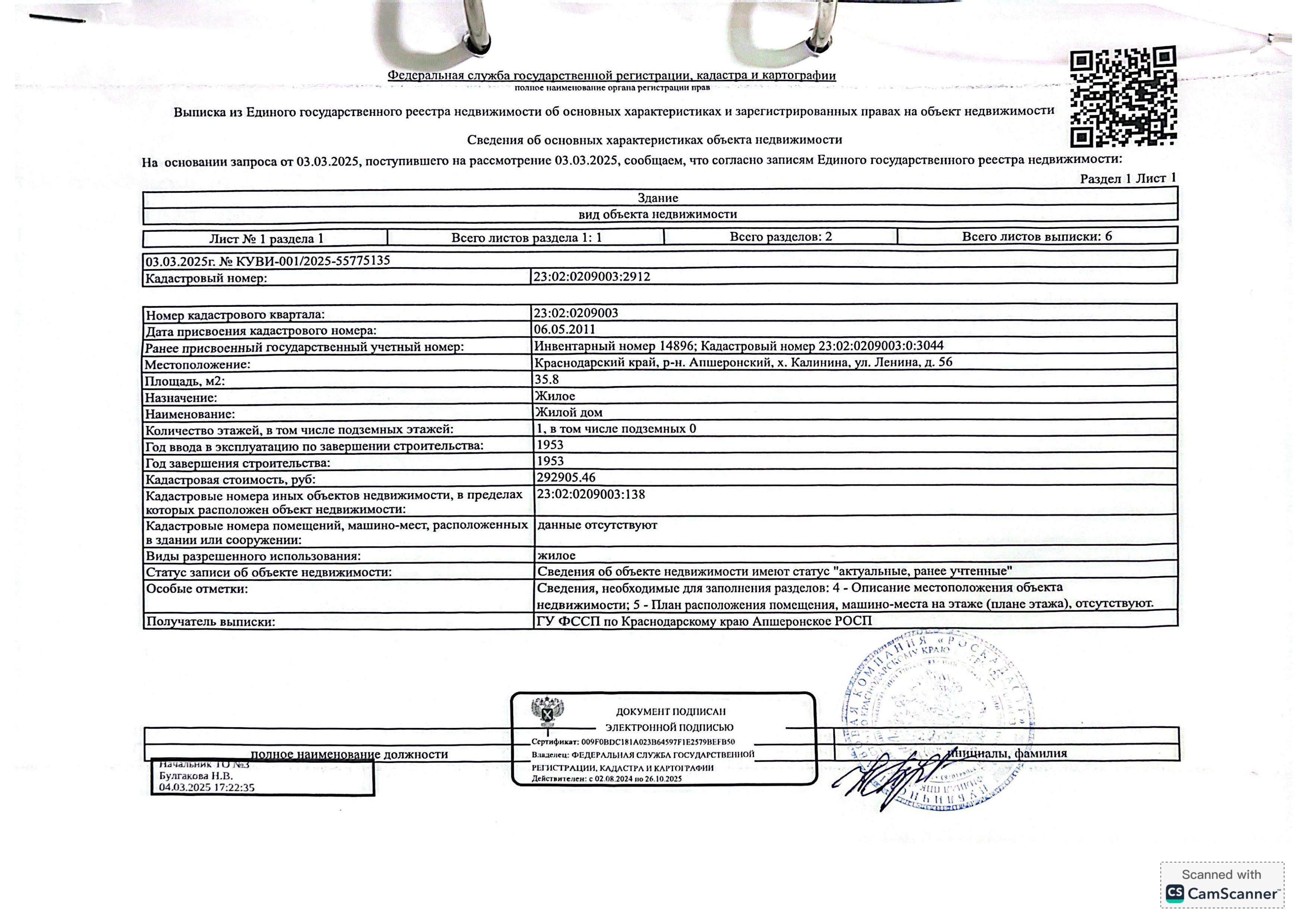Д-к: Ковалевский Н.Н. 1/6 доля общей долевой собственности жилого здания, площадь 35,8 кв.м., кадастровый номер 23:02:0209003:2912. 1/6 доля общей долевой собственности земельного участка, площадь 1500 кв.м., кадастровый номер 23:02:0209003:138. Адрес: Краснодарский край, Апшеронский район, х.Калинина, ул. Ленина, д. 56. Границы земельного участка не установлены в соответствии с требованиями земельного законодательства. Начальная цена 238 413,10 руб., задаток 35 762 руб., шаг аукциона 2 385 руб.