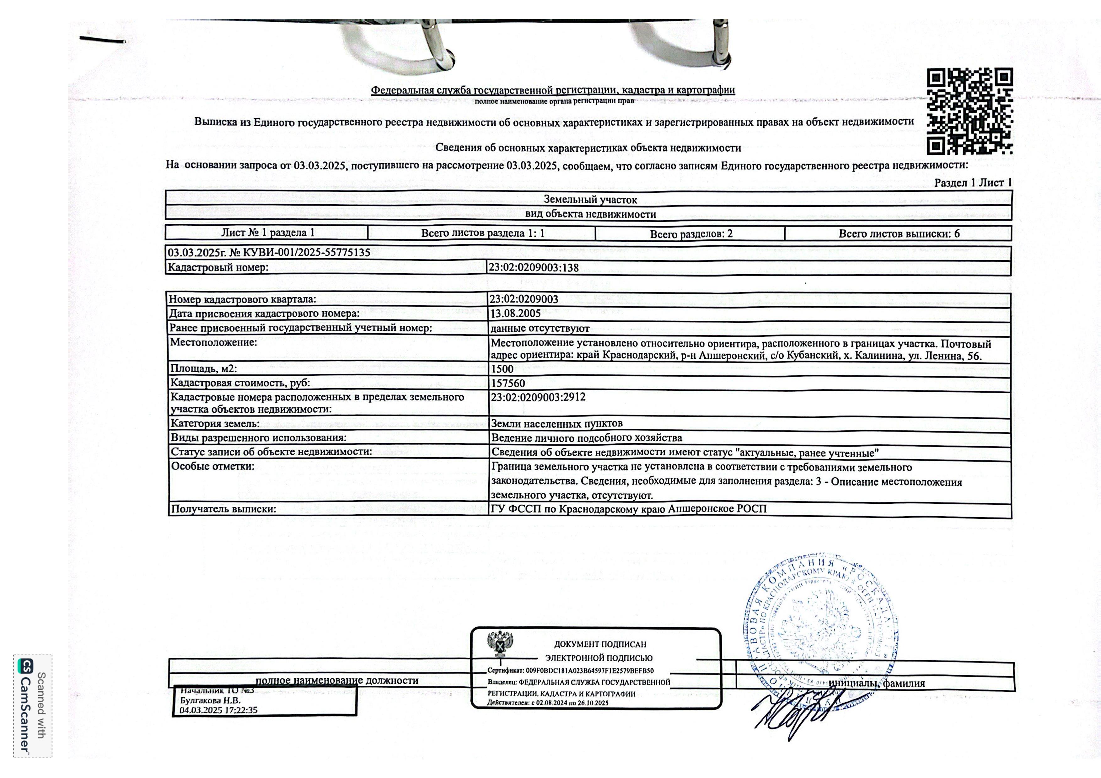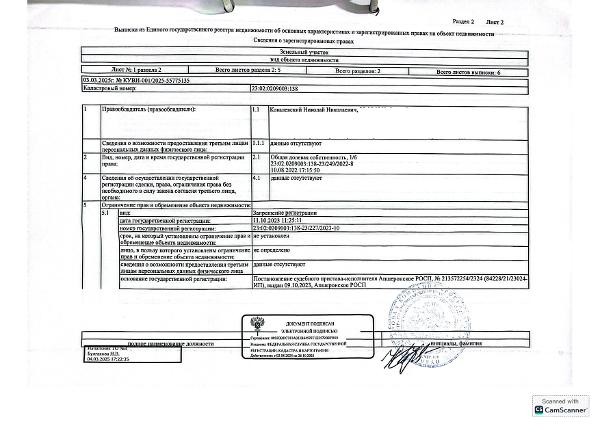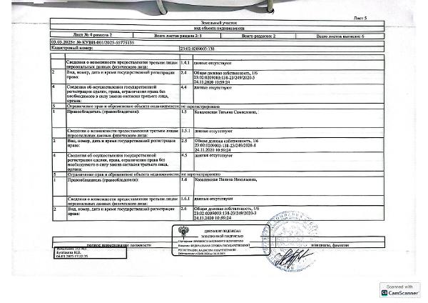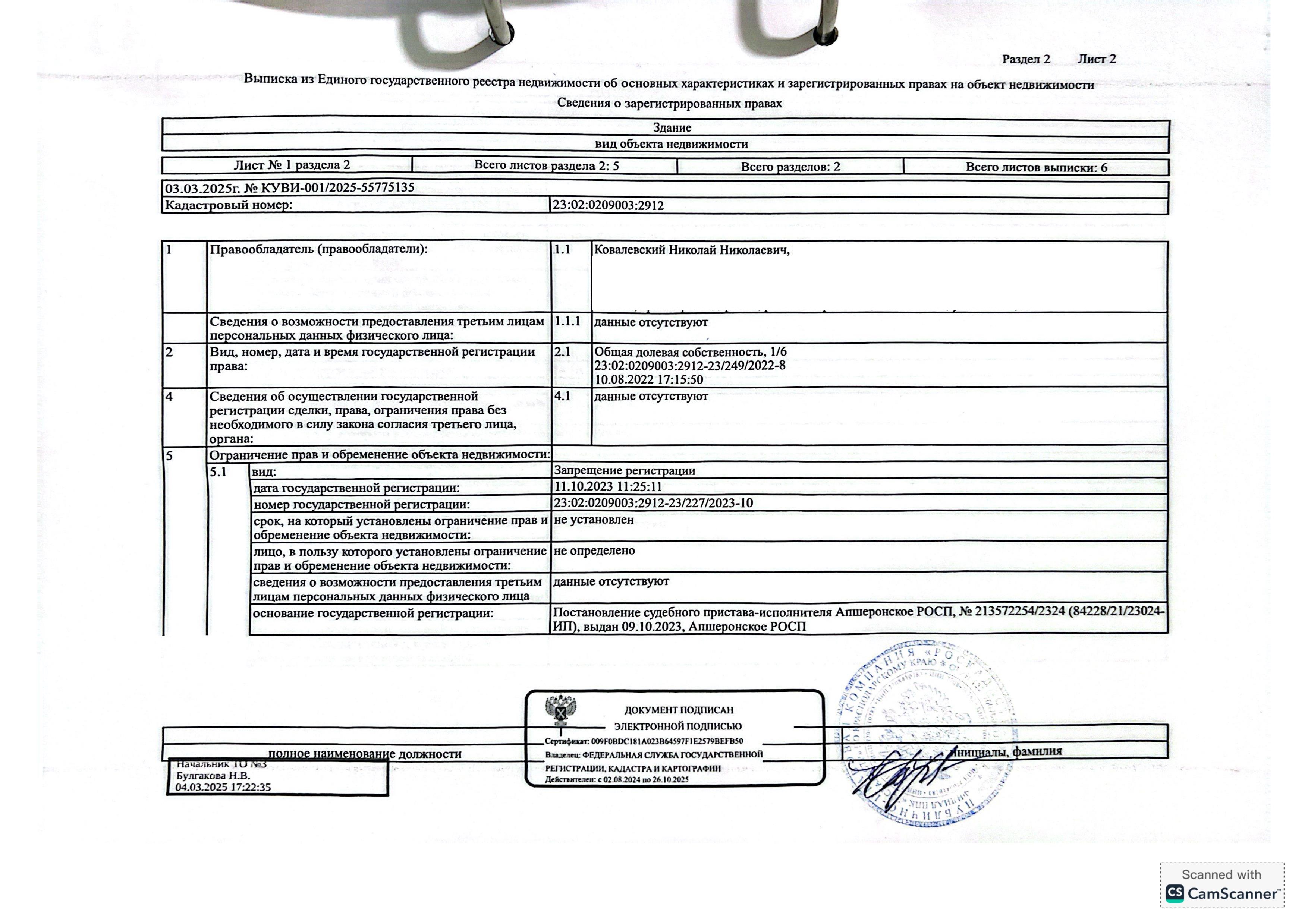 Д-к: Ковалевский Н.Н. 1/6 доля общей долевой собственности жилого здания, площадь 35,8 кв.м., кадастровый номер 23:02:0209003:2912. 1/6 доля общей долевой собственности земельного участка (для ведения подсобного хозяйства), площадь 1500 кв.м., кадастровый номер 23:02:0209003:138. Адрес: Краснодарский край, Апшеронский район, х. Калинина, ул. Ленина, д. 56. Границы земельного участка не установлены в соответствии с требованиями земельного законодательства. Начальная цена 238 413,10 руб., задаток 35 762 руб., шаг аукциона 2 385 руб., ув. 1506