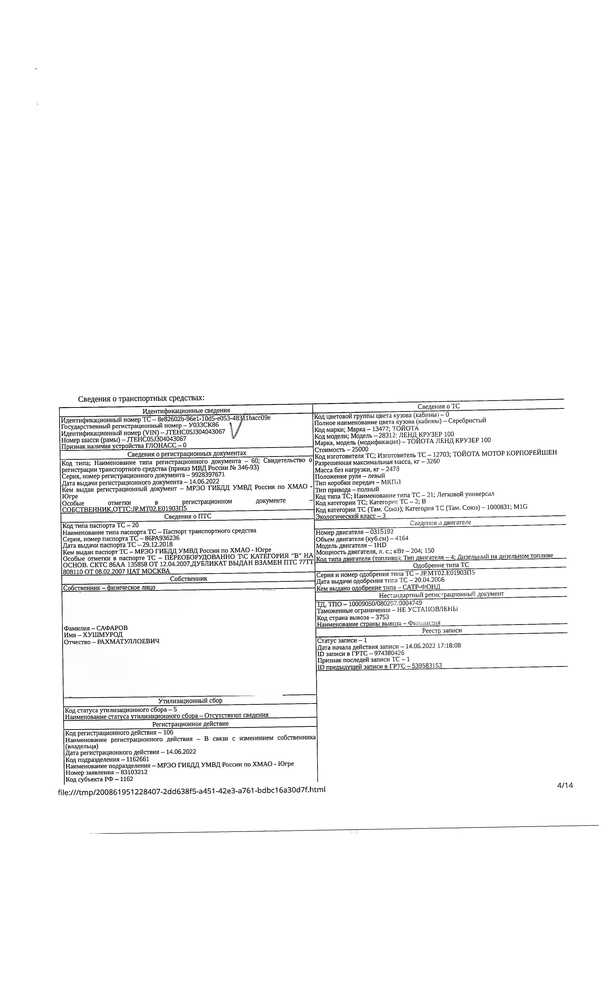 Должник: Сафаров Х.Р., собственник: Сафаров Х.Р. Лот: Транспортное средство, легковой автомобиль Тойота Ленд Крузер 100, 2006 г.в., г/н У033СК86, VIN JTEHC05J304043067, цвет серебристый, пробег - 808419 км., г. Ханты-Мансийск, ул. Заводская, д. 3, н/ц: 1587290 р., з-к: 238094 р., код: 0001, рег. № 25-509-ГМУ