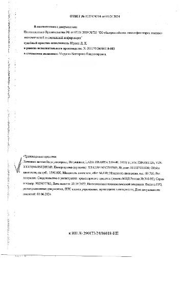 Должник: Марусяк Е.В., собственник: Марусяк Е.В. Лот: Транспортное средство, легковой универсал LADA GRANTA 219440, 2022г.в., г/н: Н893МТ126, VIN: XTA219440N0209369, г. Сургут, ул. Инженерная, д. 1/5, н/ц: 460445 р., з-к: 69067 р., код: 0001, рег. № 25-517