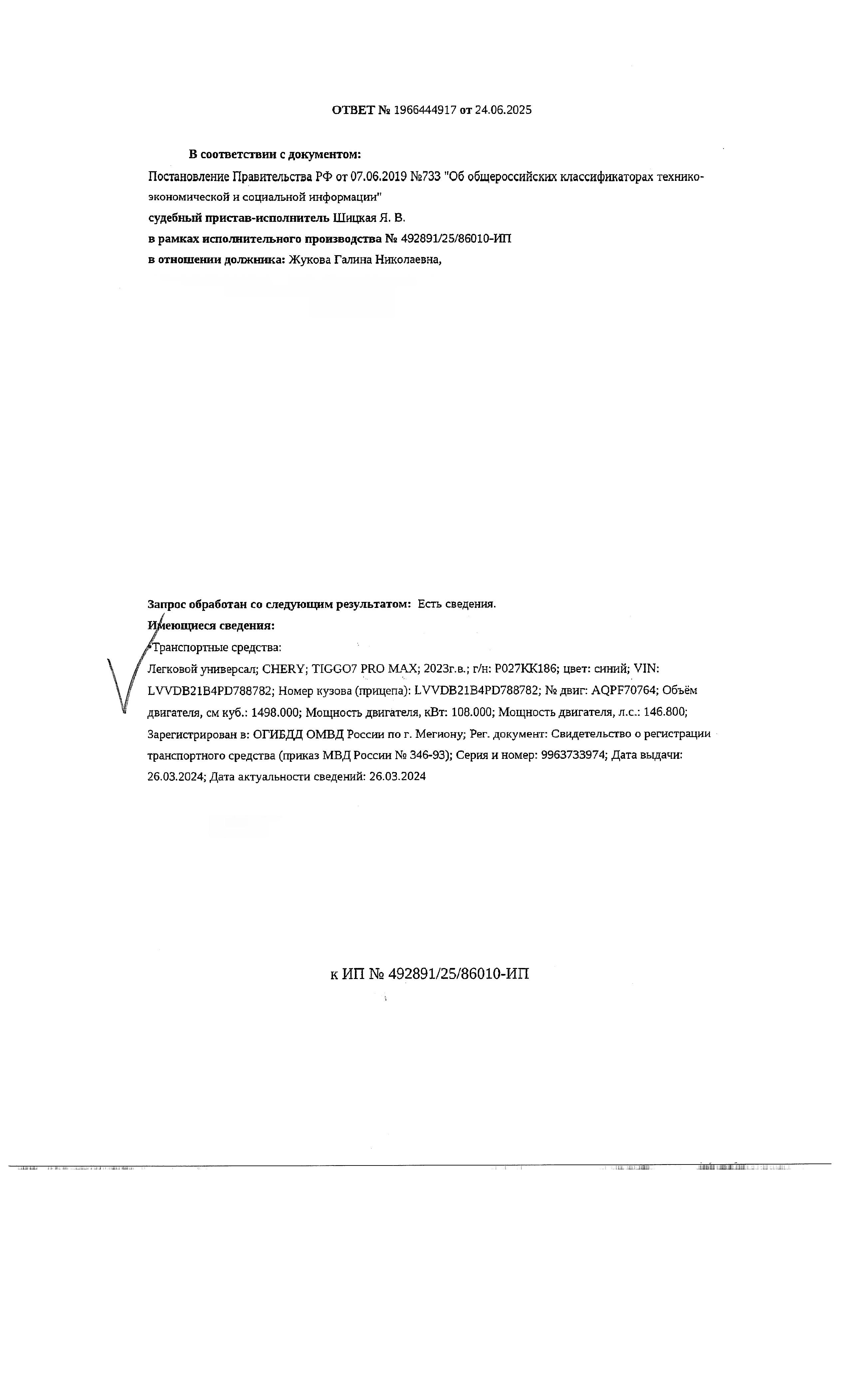 Должник: Жукова Г.Н., собственник: Жукова Г.Н. Лот: Транспортное средство, легковой универсал CHERY TIGGO7 PRO МАХ, 2023г.в., г/н: Р027КК186, VIN: LWDB21B4PD788782, цвет синий, скол заднего бампера, г. Нижневартовск, ул. Дзержинского, д. 12, н/ц: 1286220 р., з-к: 192933 р., код: 0001, рег. № 25-516