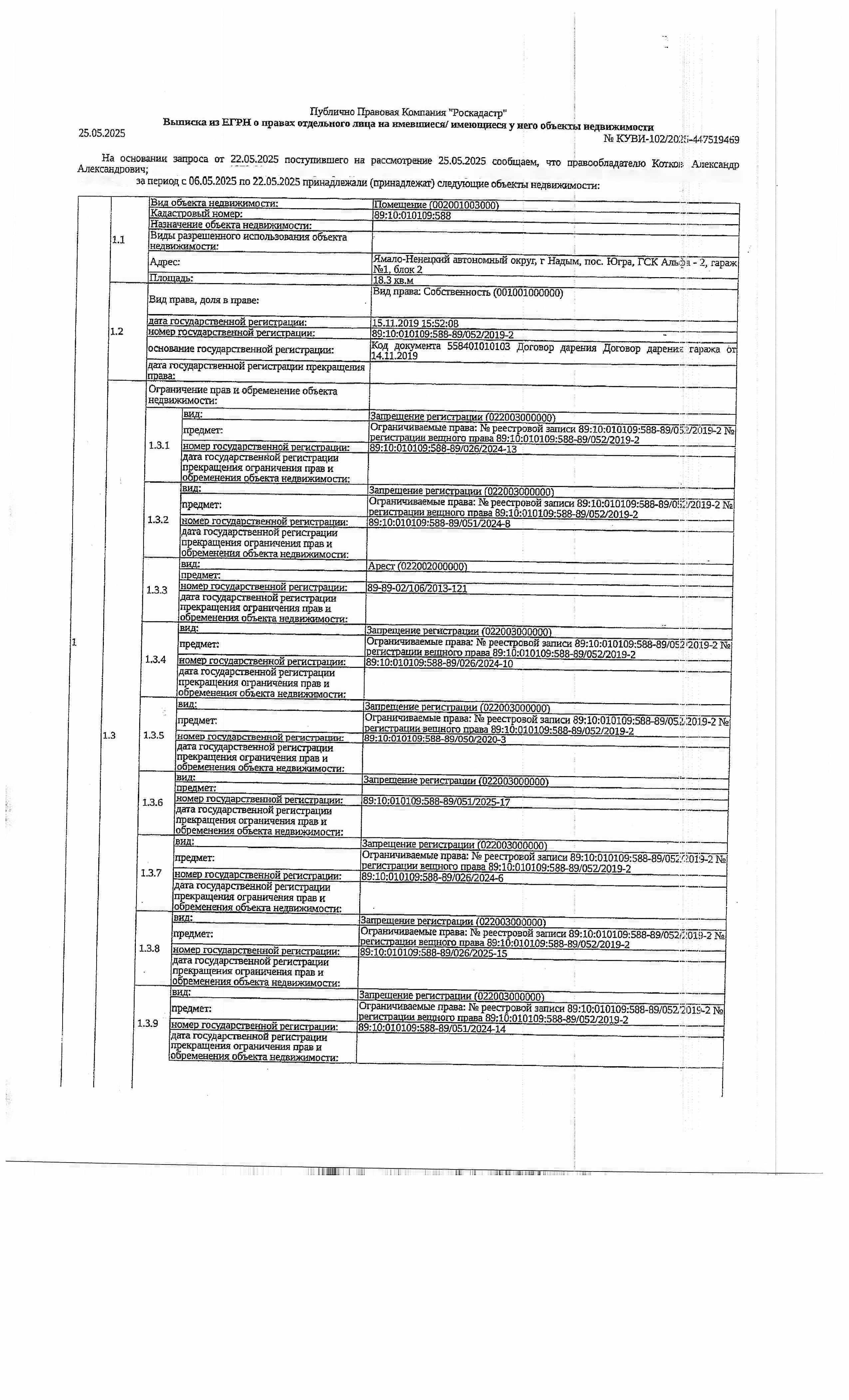 Нежилое помещение, площадь 18,30 кв.м., кадастровый номер: 89:10:010109:588, г. Надым, пос. Югра, ГСК Альфа - 2, гараж №1, блок рег.№ 25-172;