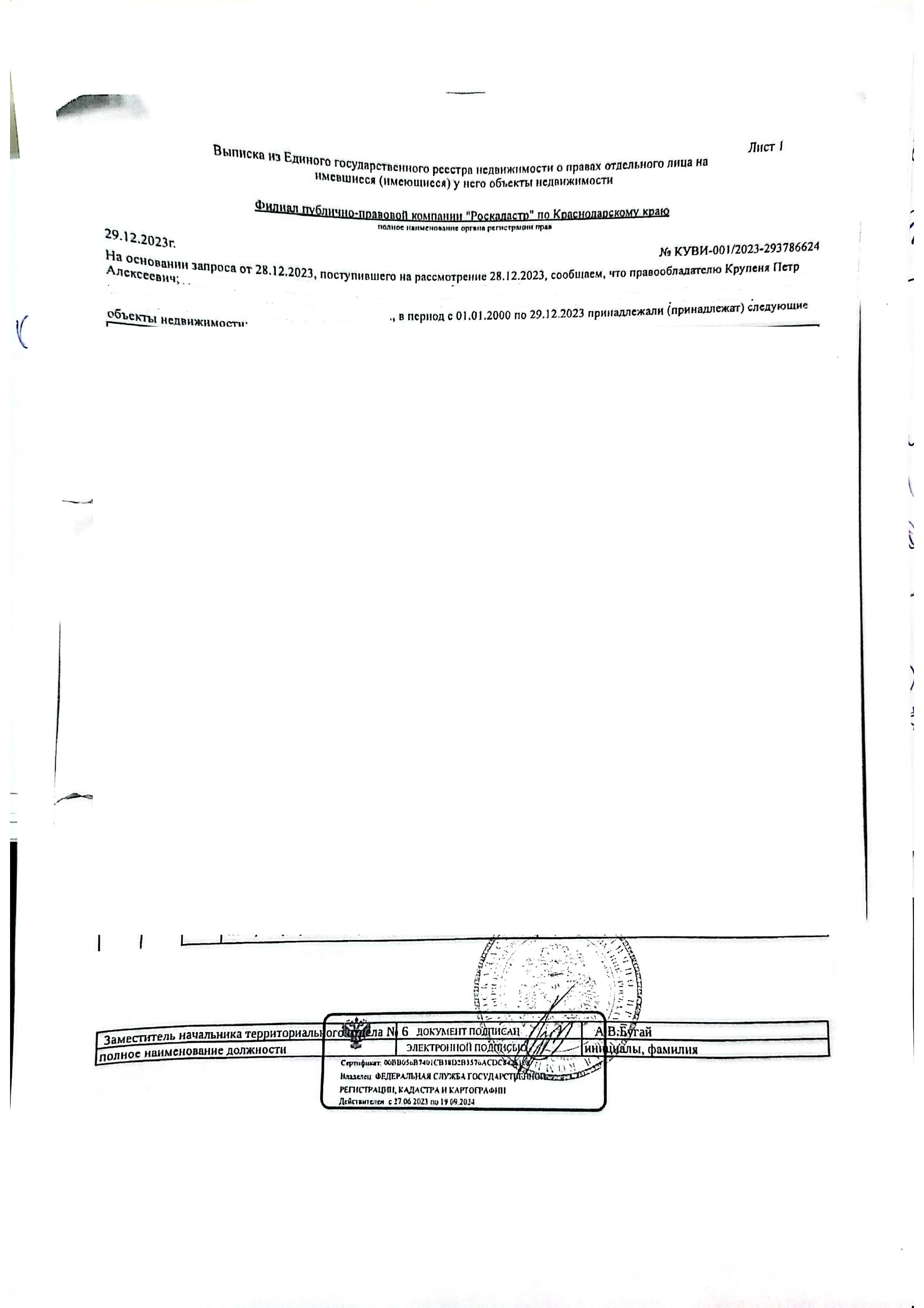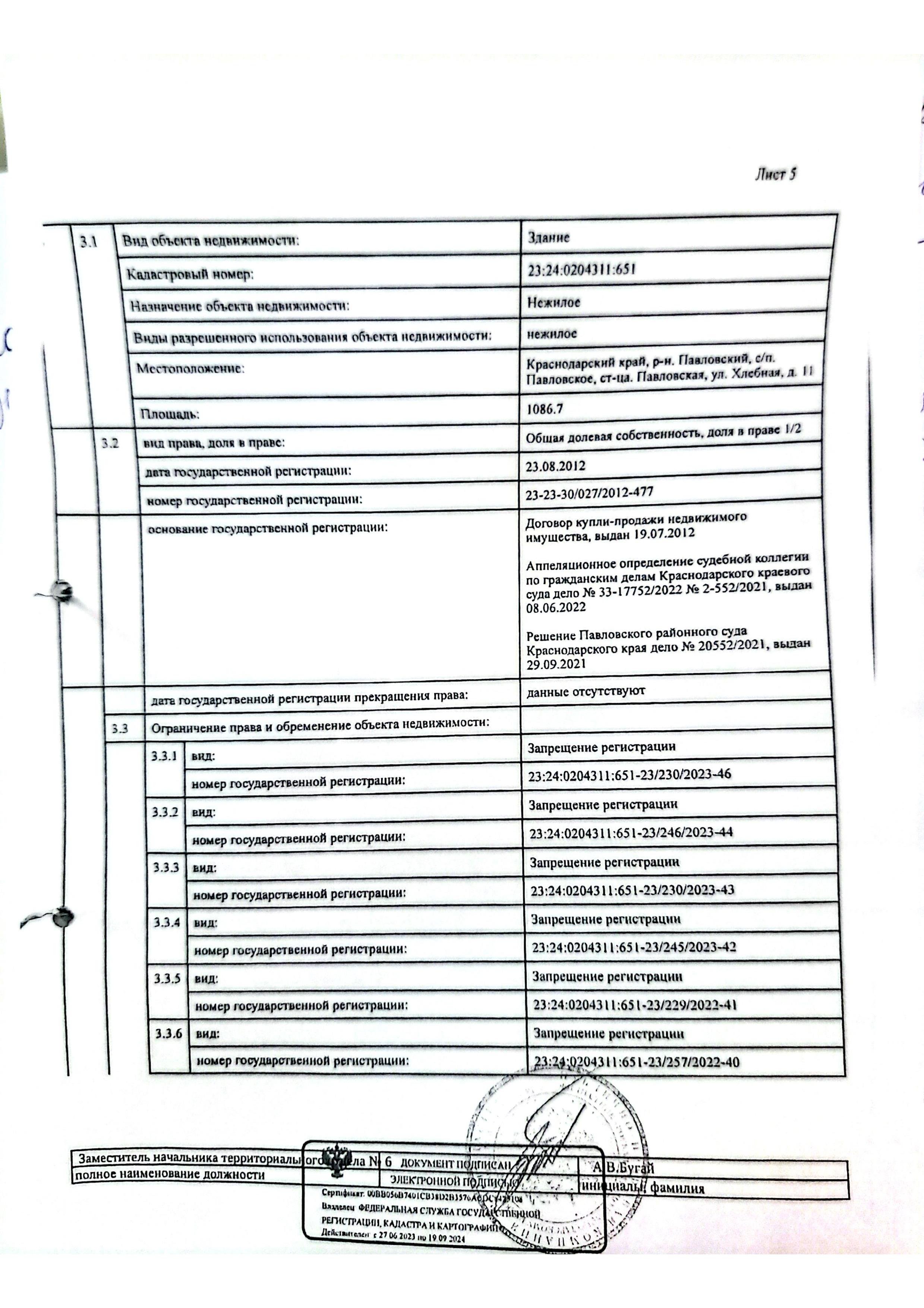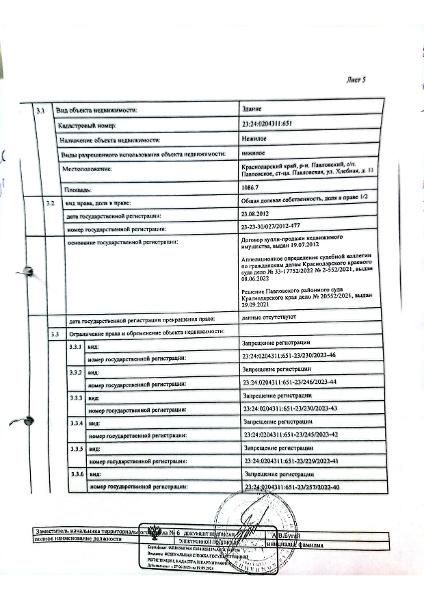 Д-к: Крупеня П.А. Право аренды земельного участка, площадь 11905 кв.м., кадастровый номер 23:24:0204331:585. Адрес: Краснодарский край, Павловский район, ст. Павловская, ул. Хлебная, 13; 1/2 доли в общей долевой собственности на здание скотобойного цеха, площадь 1086,7 кв.м., кадастровый номер 23:24:0204311:651. Адрес: Краснодарский край, Павловский район, ст. Павловская, ул. Хлебная, 11. Начальная цена 18 684 532 руб., задаток 2 802 680 руб., шаг аукциона 186 846 руб., ув. 1731