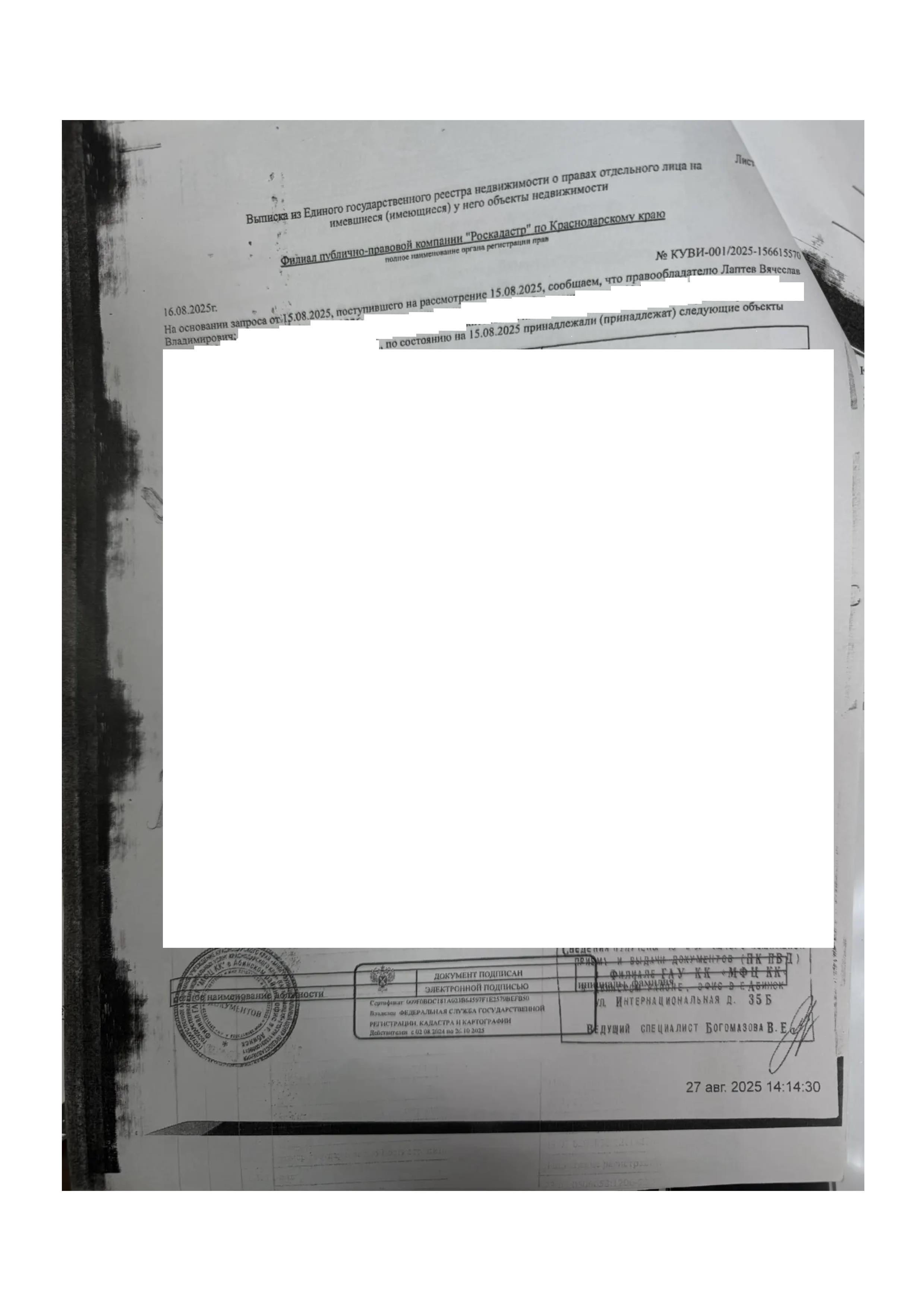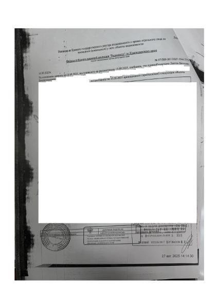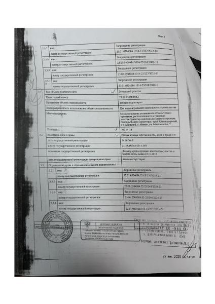 Д-к: Лаптев В.В. 1/6 доля в праве общей долевой собственности на жилой дом, площадь 100,1 кв.м., кадастровый номер 23:01:0504084:1014. 1/6 доля в праве общей долевой собственности на земельный участок (для индивидуального жилищного строительства), площадь 799 кв.м., кадастровый номер 23:01:0504084:52. Адрес: Краснодарский край, Абинский район, г. Абинск, ул. Мельничная, 7. Начальная цена 1 004 800 руб., задаток 150 720 руб., шаг аукциона 10 048 руб., ув. 1791