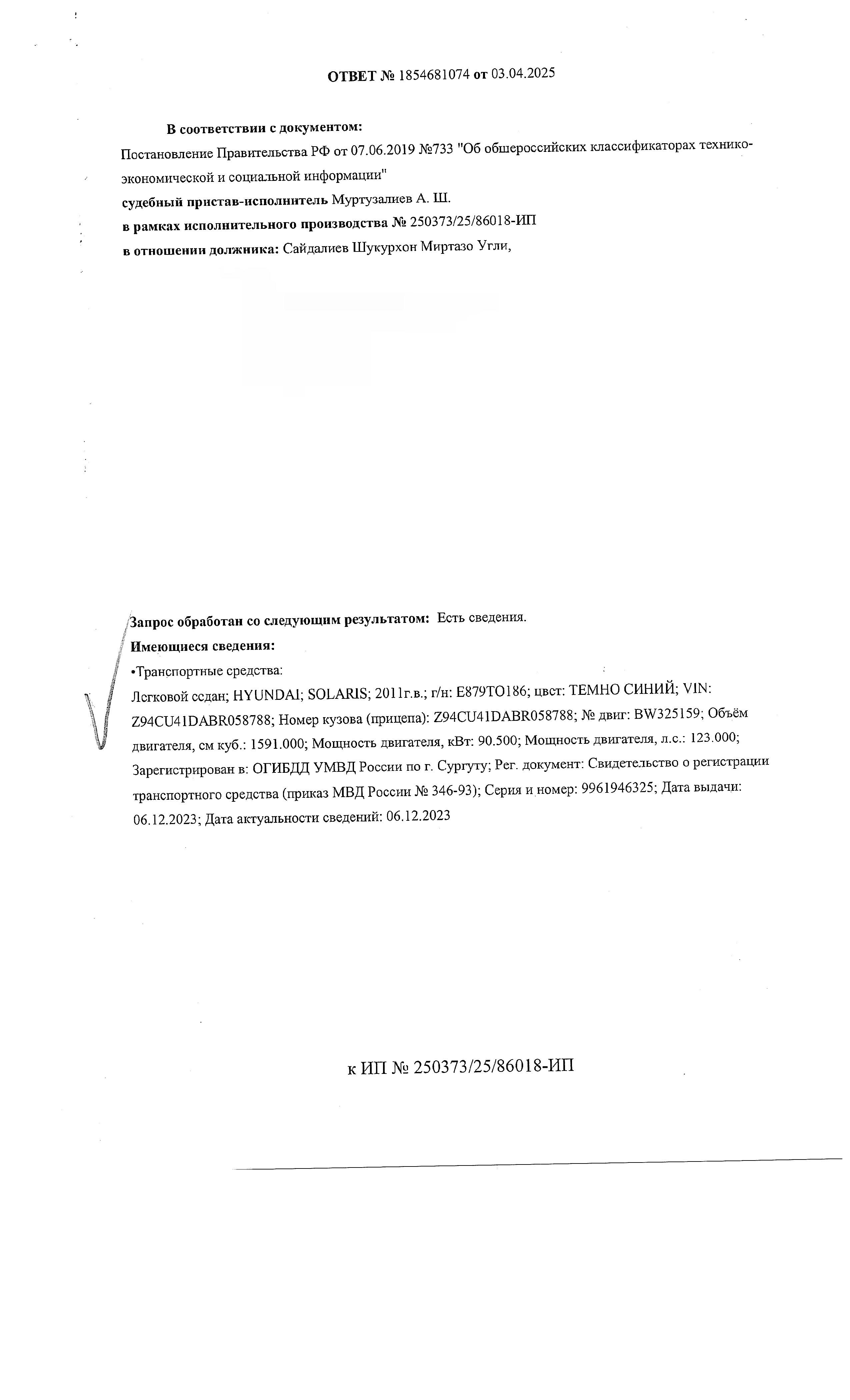 Должник: Сайдалиев Ш.М.у., собственник: Сайдалиев Ш.М.у. Лот: Транспортное средство, легковой седан Hyundai Solaris, 2011 г.в., г/н Е879ТО86, VIN Z94CU41DABR058788, г. Сургут, ул. Генерала Иванова, д. 6 (в залоге у третьего лица, имущество реализуется с сохранением залога при переходе прав на имущество от залогодателя - должника к покупателю), н/ц: 340935 р., з-к: 51141 р., код: 0001, рег. № 25-457