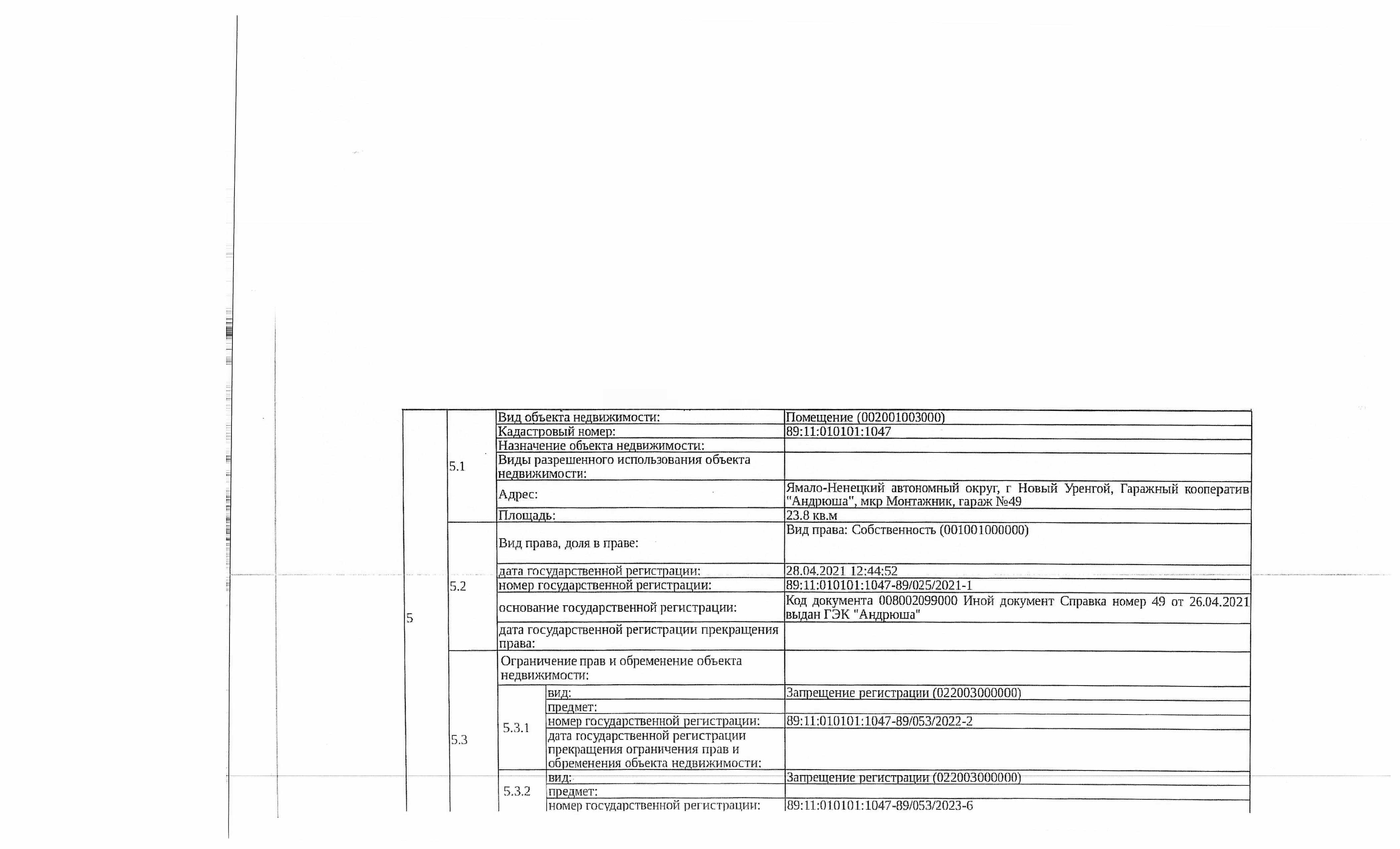 Нежилое помещение, площадь 23,80 кв.м., кадастровый номер: 89:11:010101:1047, г. Новый Уренгой, Гаражный кооператив "Андрюша", мкр. Монтажник, гараж №49, рег.№ 25-174;