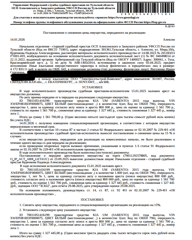 Легковой автомобиль КIА UМ (SОRЕNТО) 2015 г.в. г/н Р850ХН71, VIN XWEPH81BDF0000076, цвет белый. Место хранения: Тульская обл., рп. Заокский, ул. Таежная, 4. Ответственный хранитель Янголенко И.С. Взыскатель: ООО «Электросетьстрой-Комплект». Начальная цена: 1 327 445 (Один миллион триста двадцать семь тысяч четыреста сорок пять) руб. 00 коп., без НДС. Задаток: 660 000 (Шестьсот шестьдесят тысяч) руб. 00 коп.; Шаг аукциона 1%: 13 274 (Тринадцать тысяч двести семьдесят четыре) руб. 45 коп.