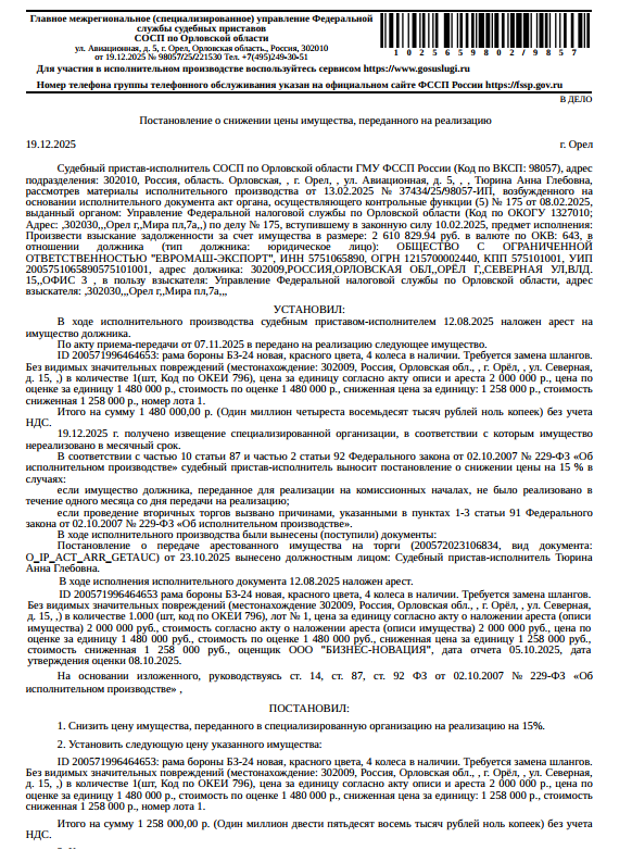 Рама бороны Б3-24 новая, красного цвета, 4 колеса в наличии, требуется замена шлангов, без видимых значительных повреждений. Место хранения: г. Орел, ул. Северная, д. 15. Ответственный хранитель Авдеев Я.В. Взыскатель: УФНС по Орловской области. Начальная цена 1 258 000 (Один миллион двести пятьдесят восемь тысяч) руб. 00 коп., без НДС, сумма задатка 620 000 (Шестьсот двадцать тысяч) руб. 00 коп. Шаг аукциона 1%: 12 580 (Двенадцать тысяч пятьсот восемьдесят) руб. 00 коп.