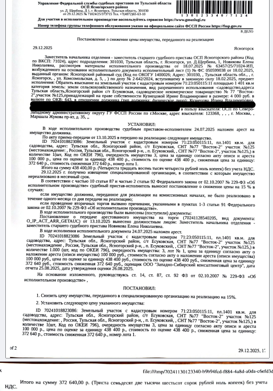 Земельный участок, категория земель: земли сельскохозяйственного назначения, виды разрешенного использования: садоводство, площадь 1401 +/- 26 кв.м., кадастровый номер 71:23:050115:11, местоположение: обл. Тульская, р-н Ясногорский, Есуковская с/т, Садоводческое некоммерческое товарищество №77 "Восток-2", участок № 125. Взыскатель: ОСП по Северо-Западному административному округу ГУ ФССП России по г. Москве.