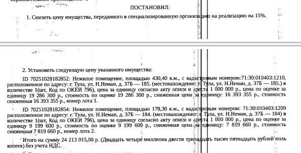Земельный участок, категория земель: земли сельскохозяйственного назначения, виды разрешенного использования: садоводство, площадь 1401 +/- 26 кв.м., кадастровый номер 71:23:050115:11, местоположение: обл. Тульская, р-н Ясногорский, Есуковская с/т, Садоводческое некоммерческое товарищество №77 "Восток-2", участок № 125. Особые отметки: граница земельного участка состоит из 2 контуров. Учетные номера контуров и их площади: 1 -1025.78 кв.м, 2 - 375.43 кв.м. Вид ограничений (обременений): ограничения прав на земельный участок, предусмотренные ст. 56 ЗК РФ. Взыскатель: ОСП по Северо-Западному административному округу ГУ ФССП России по г. Москве. Начальная цена: 372 640 (Триста семьдесят две тысячи шестьсот сорок) руб. 00 коп., без НДС. Задаток: 180 000 (Сто восемьдесят тысяч) руб. 00 коп.; Шаг аукциона 1%: 3 726 (Три тысячи семьсот двадцать шесть) руб. 40 коп.