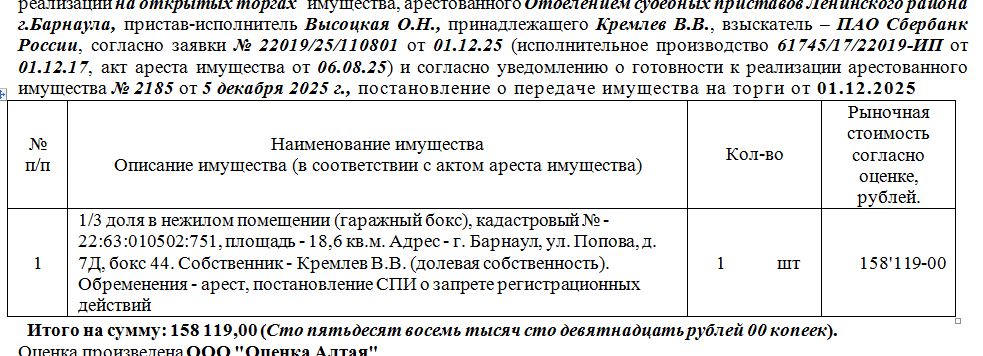 Лот№2 1/3 доля в нежилом помещении (гаражный бокс), кадастровый № - 22:63:010502:751, площадь - 18,6 кв.м. Адрес - г. Барнаул, ул. Попова, д. 7Д, бокс 44. Нач.цена 158119 руб. (Кремлев В.В. (долевая собственность)., арест, постановление СПИ о запрете регистрационных действий) (2185)
