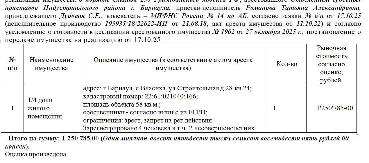 Лот№3 1/4 доли жилого помещения кадастровый номер: 22:61:021040:166; площадь объекта 58 кв.м.. адрес: г.Барнаул, с.Власиха, ул.Строительная д.28 кв.24. Зарегистрировано 4 человека в т.ч. 2 несовершенолетних. Нач. цена 1250785 руб. (согласно выписке из ЕГРН, должник Дубовая С.Е.,ограничения: арест, запрет на рег.действия) (1902)