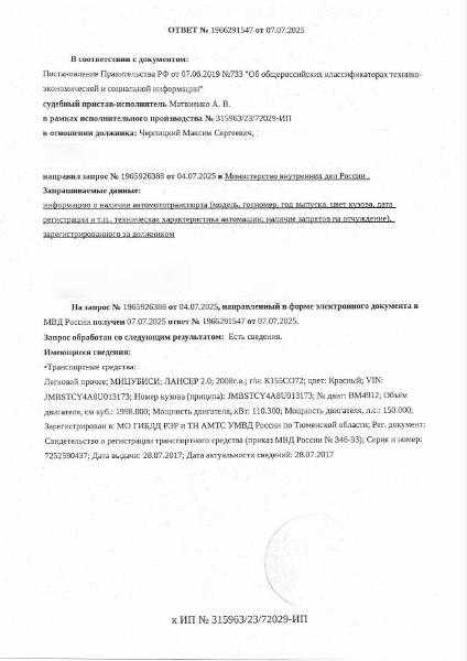 Должник: Черпицкий М.С., собственник: Черпицкий М.С. Лот: Транспортное средство, легковой автомобиль, МИЦУБИСИ ЛАНСЕР 2.0, 2008 г.в., г/н К155СО72, VIN: JMBSTCY4A8U013173, цвет красный (вмятина на заднем правом крыле) г. Тюмень, ул. Старотобольский тракт, д.155, н/ц: 517395 р., з-к: 77609 р., код: 0001, рег.№ 72-010538;