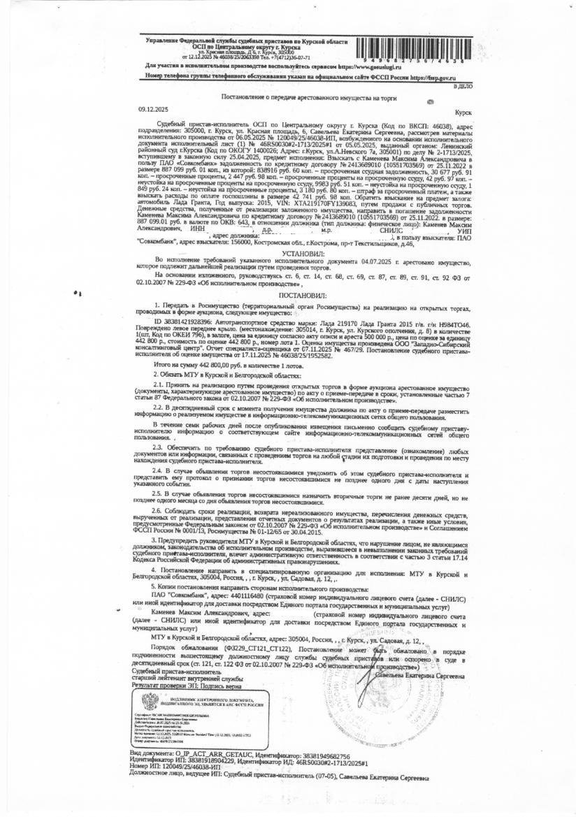 Легковой автомобиль Lada 219170 Lada Granta, 2015 года выпуска, цвет – серо-синий, государственный номер H984TO46, идентификационный номер (VIN) XTA219170FY139083, номер кузова (прицепа) XTA219170FY139083, номер двигателя 3381815, повреждено левое переднее крыло (имущество обременено: арест, запрет на совершение регистрационных действий, залог (взыскатель) – ПАО «Совкомбанк»). Должник – Каменев М.А. Основание проведения аукциона: исполнительный лист Ленинского районного суда г. Курска №46RS0030#2-1713/2025#1 от 05.05.2025