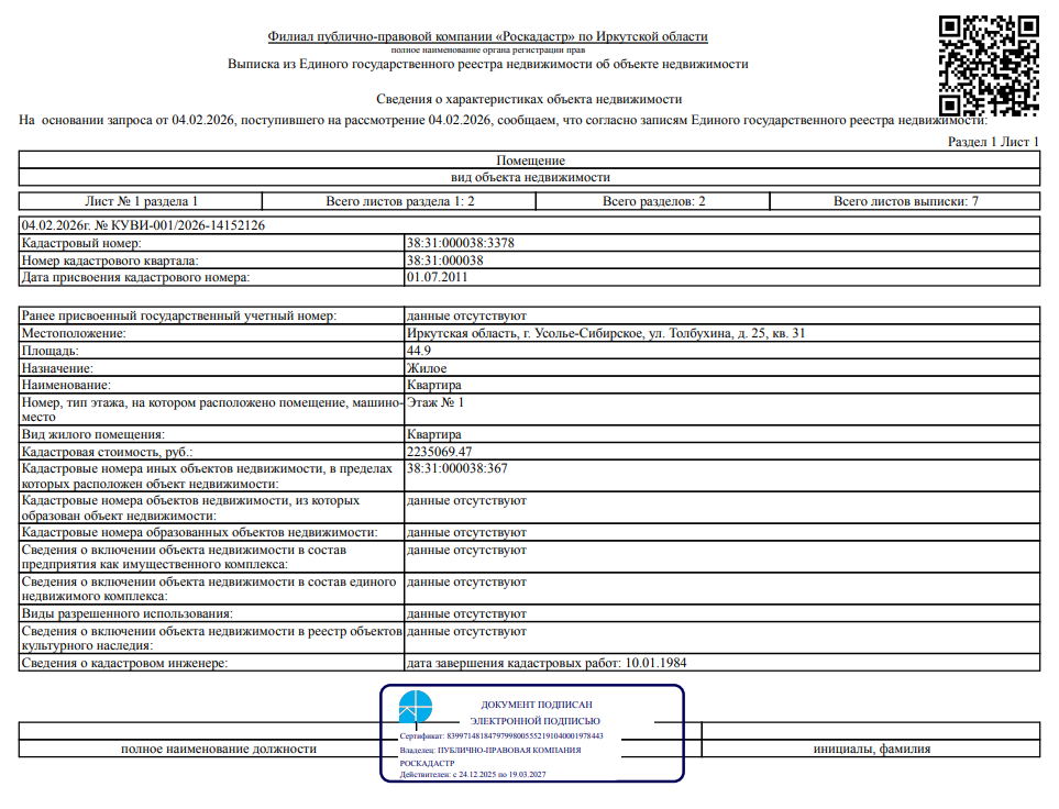 5/16 долей в праве общей долевой собственности на жилое помещение общей площадью 44,9 кв. м, кадастровый номер 38:31:000038:3378, местоположение: Иркутская обл., г. Усолье-Сибирское, ул. Толбухина, д. 25, кв. 31.