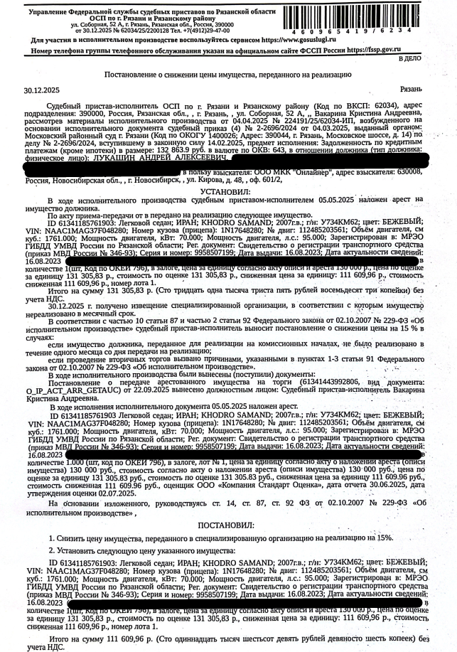 Автомобиль легковой седан ИРАН KHODRO SAMAND, 2007 г.в, г/н У734КМ62, VIN NAAC1MAG37F048280. Место хранения: г. Рязань, Касимовское ш., д. 46 а (стоянка). Ответственный хранитель Кузина С.Г. Залогодержатель: ООО МКК «Онлайнер». Начальная цена 111 609 (Сто одиннадцать тысяч шестьсот девять) руб. 96 коп., без НДС, сумма задатка 50 000 (Пятьдесят тысяч) руб. 00 коп. Шаг аукциона 1%: 1 116 (Одна тысяча сто шестнадцать) руб. 10 коп.