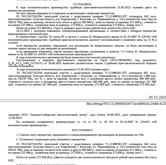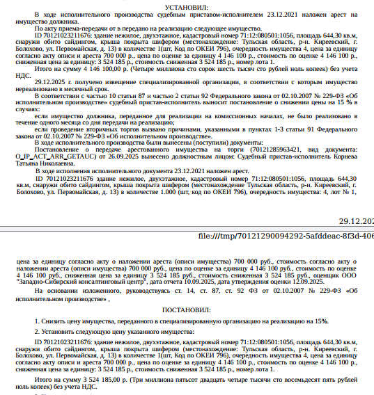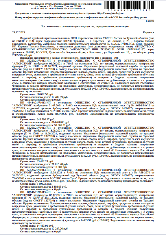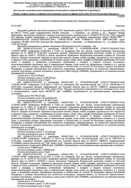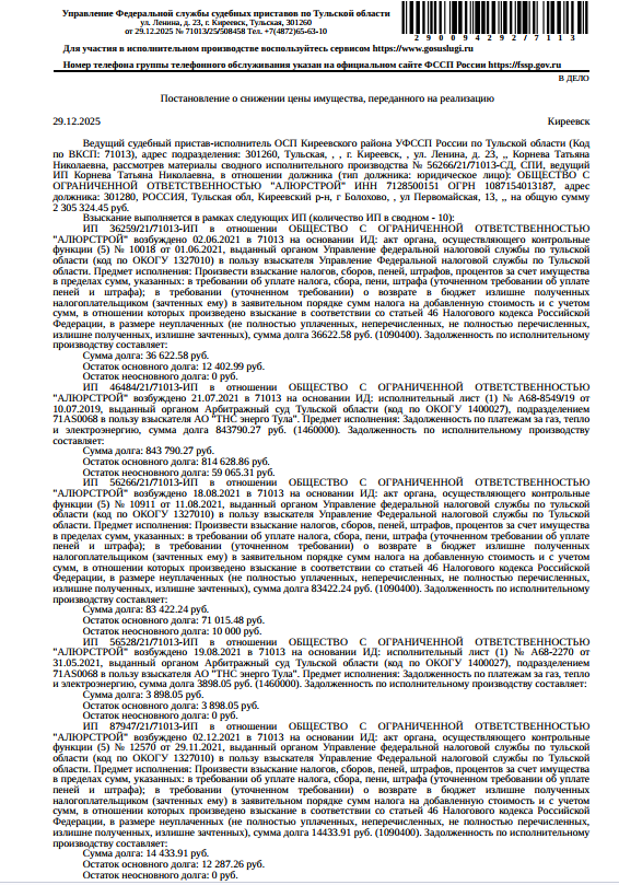 Здание, нежилое, наименование: контора, площадь 644,3 кв.м., кадастровый номер 71:12:080501:1056, адрес: Тульская область, р-н. Киреевский, г. Болохово, ул. Первомайская, д. 13. Земельный участок, земли населенных пунктов, виды разрешенного использования: для производственной деятельности, площадь 662 +/- 0.4 кв.м., кадастровый номер 71:12:080501:337, адрес: обл. Тульская, р-н Киреевский, г. Болохово, ул. Первомайская, дом 13.Взыскатель: УФНС по Тульской обл., АО «ТНС энерго Тула» и др.
