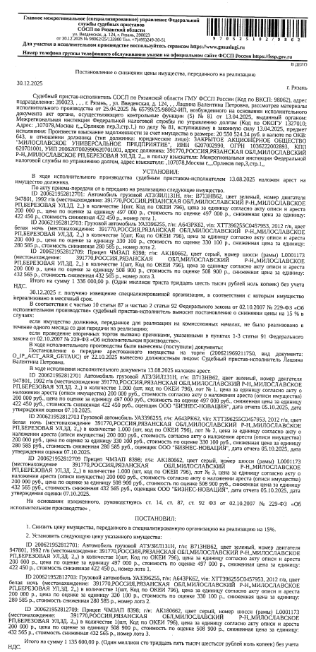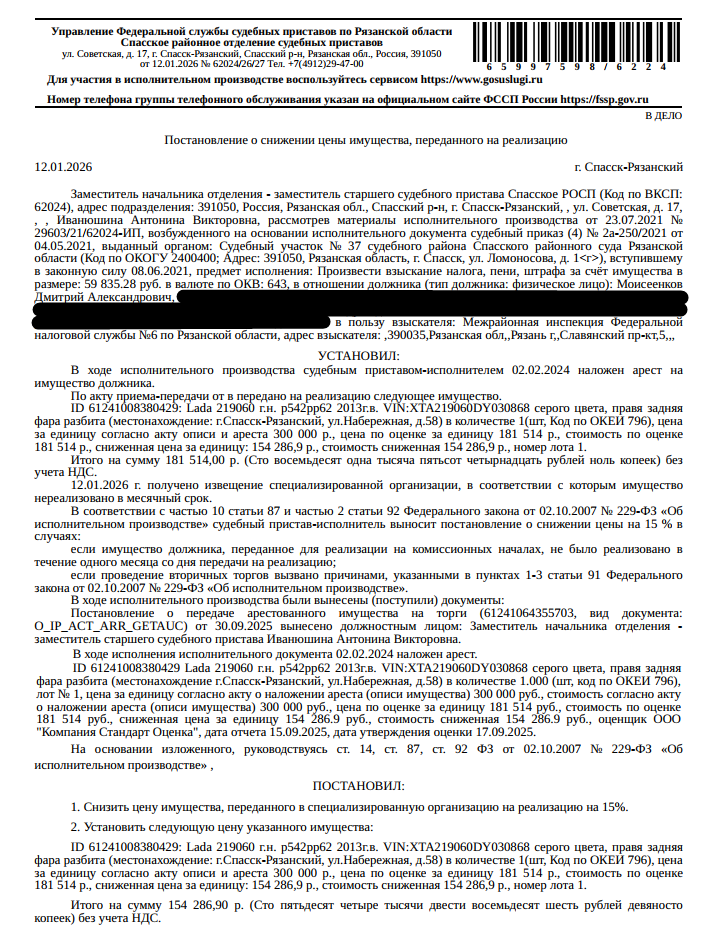 Автомобиль легковой LАDА219060, 2013 г.в, VIN XTA219060DY030868, г/н Р542РР62, цвет серебристый, правая задняя фара разбита. Место хранения: г. Спасск-Рязанский, ул. Набережная, 58. Ответственный хранитель Моисеенков Д.А. Согласно реестру уведомлений о залоге имущество находится в залоге у ООО КБ «АйМаниБанк». Реализация имущества должника не лишает права залогодержателя на обращение взыскания на предмет залога. Взыскатель: МИФНС № 6 по Рязанской области.