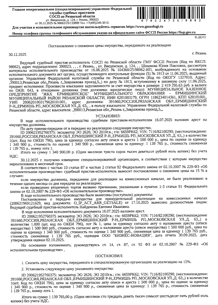 Экскаватор ЭО 2626, 2010 г.в., г/н 6659РК62; заводской номер 7116/82100290, цвет синий, техническое состояние не проверялось. Место хранения: Рязанская обл., рп. Ермишь, ул. Московская, д.63. Ответственный хранитель Алексеева И.А. Взыскатель УФНС по Рязанской области. Начальная цена 1 139 765 (Один миллион сто тридцать девять тысяч семьсот шестьдесят пять) руб. 00 коп., без НДС, сумма задатка 560 000 (Пятьсот шестьдесят тысяч) руб. 00 коп. Шаг аукциона 1%: 11 397 (Одиннадцать тысяч триста девяносто семь) руб. 65 коп.