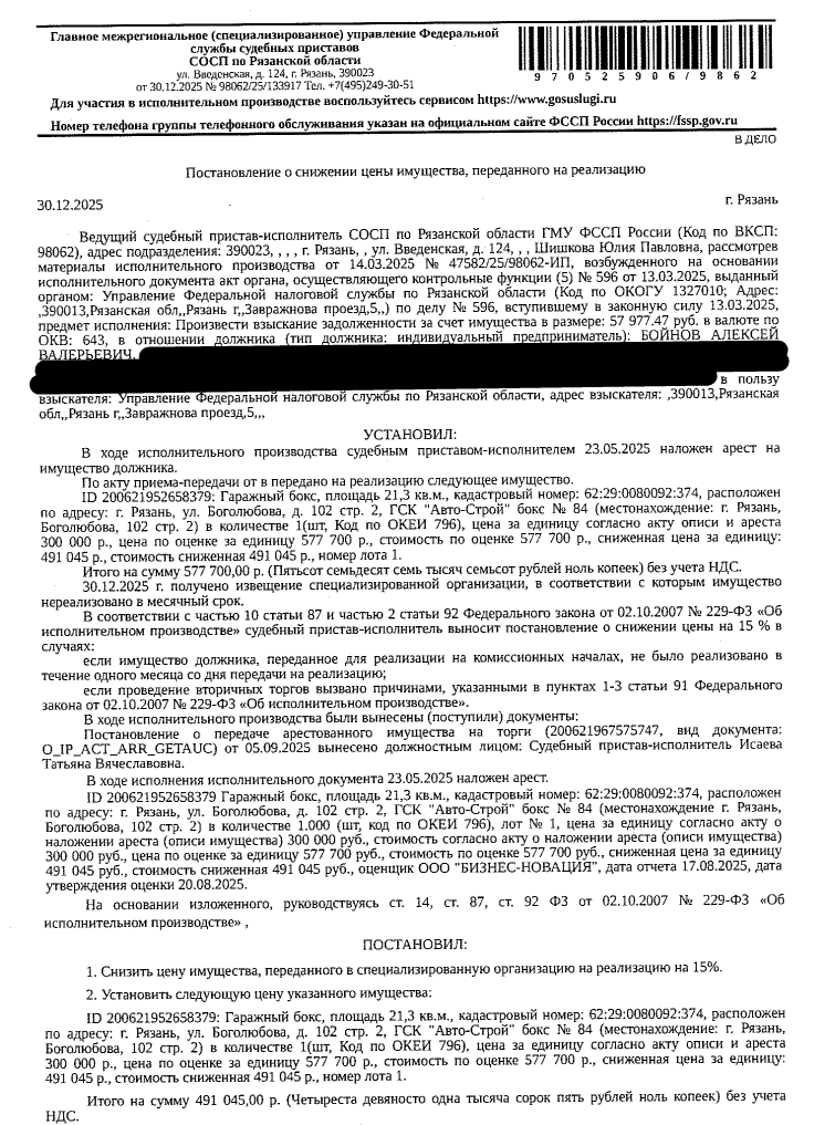 Здание, назначение: нежилое, наименование: гаражный бокс, кадастровый номер 62:29:0080092:374, площадь 21,3 кв.м, местоположение: Российская Федерация, Рязанская область, Рязань г, Боголюбова ул, 102, строен 2, ГСК "АВТОСТРОЙ",бокс №84. Здание расположено в пределах объекта недвижимости с кадастровым номером 62:29:0080092:27, сведениями о правообладателе Организатор торгов не располагает. Взыскатель: УФНС по Рязанской области. Начальная цена: 491 045 (Четыреста девяносто одна тысяча сорок пять) руб. 00 коп., без НДС, сумма задатка: 240 000 (Двести сорок тысяч) руб. 00 коп. Шаг аукциона 1%: 4 910 (Четыре тысячи девятьсот десять) руб. 45 коп.