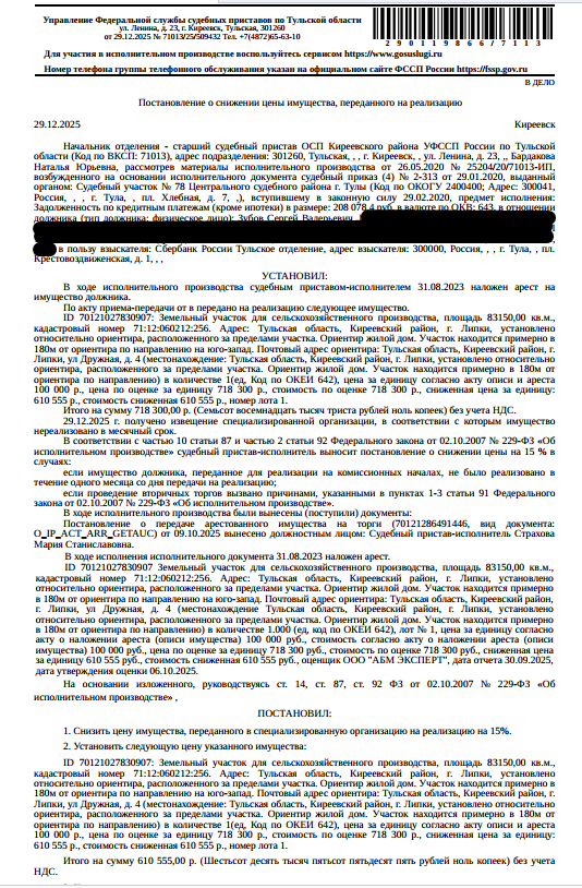 Земельный участок, категория земель: земли сельскохозяйственного назначения, виды разрешенного использования: для сельскохозяйственного производства, площадь 83150 +/- 2523 кв.м., кадастровый номер 71:12:060212:256, адрес: Тульская область, Киреевский район, г. Липки, установлено относительно ориентира, расположенного за пределами участка. Ориентир жилой дом. Участок находится примерно в 180м от ориентира по направлению на юго-запад. Почтовый адрес ориентира: обл. Тульская, р-н Киреевский, г. Липки, ул.Дружная, д.4. Взыскатель: ПАО Сбербанк. Начальная цена: 610 555 (Шестьсот десять тысяч пятьсот пятьдесят пять) руб. 00 коп., без НДС. Задаток: 300 000 (Триста тысяч) руб. 00 коп.; Шаг аукциона 1%: 6 105 (Шесть тысяч сто пять) руб. 55 коп.
