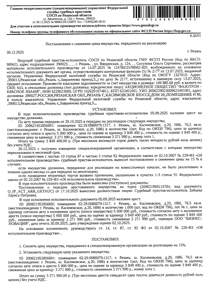 Помещение, назначение: нежилое, наименование: помещение, кадастровый номер 62:29:0080079:1317, цокольный этаж № с, площадь 76,5 кв.м, местоположение: Рязанская область, г Рязань, ш Касимовское, д 20, Н86. Взыскатель УФНС по Рязанской области. Начальная цена: 3 271 990 (Три миллиона двести семьдесят одна тысяча девятьсот девяносто) руб. 00 коп., без НДС, сумма задатка 1 600 000 (Один миллион шестьсот тысяч) руб. 00 коп. Шаг аукциона 1%: 32 719 (Тридцать две тысячи семьсот девятнадцать) руб. 90 коп.