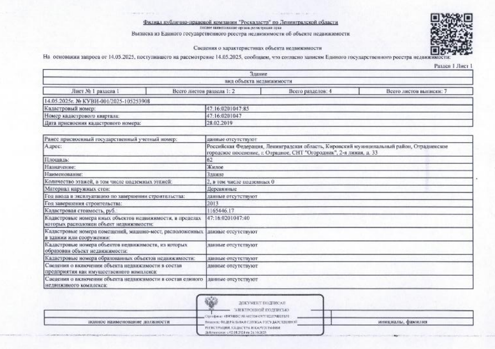 Лот№5 Подвергнутое аресту Кировским РОСП по и/п 158985/25/47026-ИП и принадлежащее должнику Цыганий А.В., арестованное имущество: Земельный участок общ. пл. 781 кв.м., кадастровый № 47:16:0201047:40 и расположенный на нем жилой дом общ. пл. 62 кв.м., кадастровый № 47:16:0201047:85, по адресу: Ленинградская область, Кировский мун. район, Отрадненское г.п., Отрадное, СНТ "Огородник", 2-я линия, д. 33. О