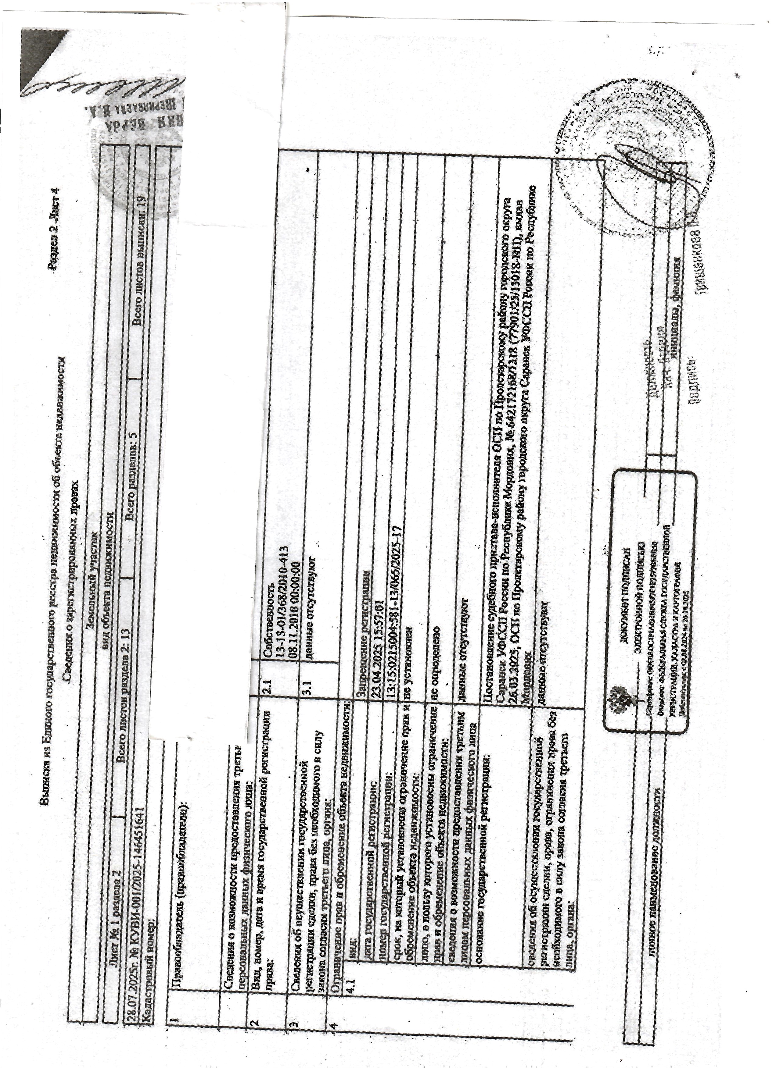 Земельный участок площадью 453+/-23 кв.м., кад. № 13:15:0215004:581, категория земель: земли населённых пунктов, виды разрешённого использования: для ведения личного подсобного хозяйства. Земельный участок принадлежит должнику Истратовой Е.Н. Сведениями о фактическом состоянии объекта недвижимости организатор торгов не располагает. Техническая документация на объект недвижимости и его фотографии отсутствуют у организатора торгов.