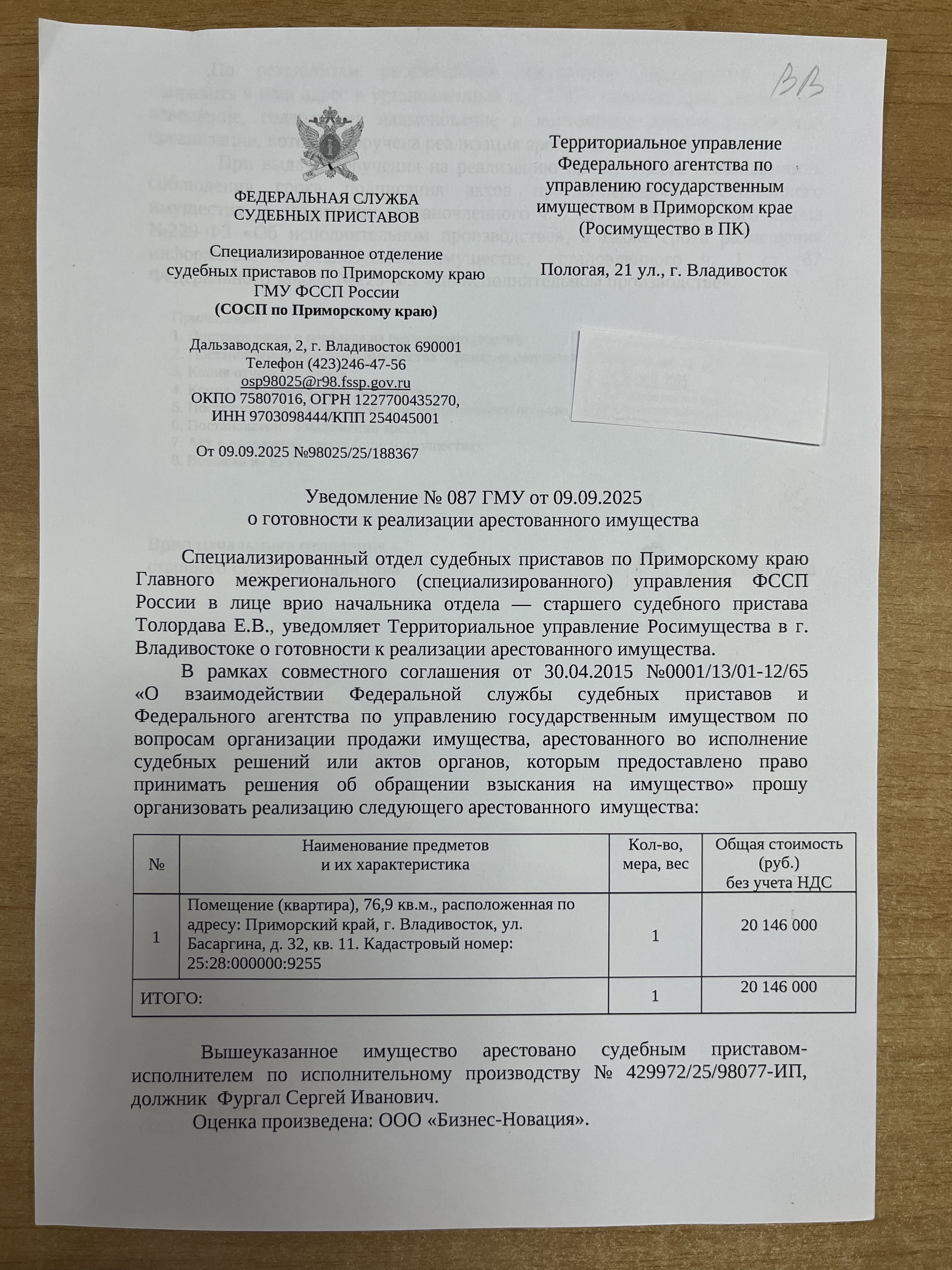 Жилое помещение (квартира) площадью 76,9 кв.м., кадастровый номер 25:28:000000:9255, расположенное по адресу: Приморский край, г. Владивосток, ул. Басаргина, д. 32, кв. 11, вид права - собственность, сведения о правах и ограничениях (обременениях): 10 записей запрещения регистрации, 2 записи об аресте, по адресу зарегистрировано 1 чел., задолженность по взносам на кап.ремонт по состоянию на 31.08.2025г составляет 50 555,45 руб., а также пени в размере 50,14 руб., задолженность по коммунальным платежам по состоянию на 31.08.2025г составляет 132 595,32 руб., а также пени в размере 108,72 руб.