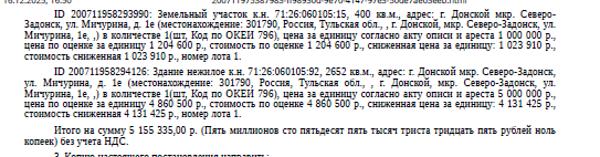 • Здание, назначение: нежилое, наименование: автомобильная мастерская, площадь 265,2 кв.м., кадастровый номер 71:26:060105:92, адрес: Российская Федерация, Тульская область, г. Донской, мкр.Северо-Задонск, ул. Мичурина, д.1е. • Земельный участок, категория земель: земли населенных пунктов, виды разрешенного использования: для строительства автомобильной мастерской, площадь 400 +/- 7 кв.м., кадастровый номер 71:26:060105:15, адрес: примерно в 70 м по направлению на юго-восток от одноэтажного жилого дома, расположенного по адресу: г. Донской, мкр. Северо-Задонск, ул. Мичурина, д. 4. Вид ограничений (обременений): ограничения прав на земельный участок, предусмотренные ст. 56 ЗК РФ. Взыскатель: УФНС по Тульской области.Начальная цена: 5 155 335 (Пять миллионов сто пятьдесят пять тысяч триста тридцать пять) руб. 00 коп., без НДС. Задаток: 2 500 000 (Два миллиона пятьсот тысяч) руб. 00 коп.; Шаг аукциона 1%: 51 553 (Пятьдесят одна тысяча пятьсот пятьдесят три) руб. 35 коп.