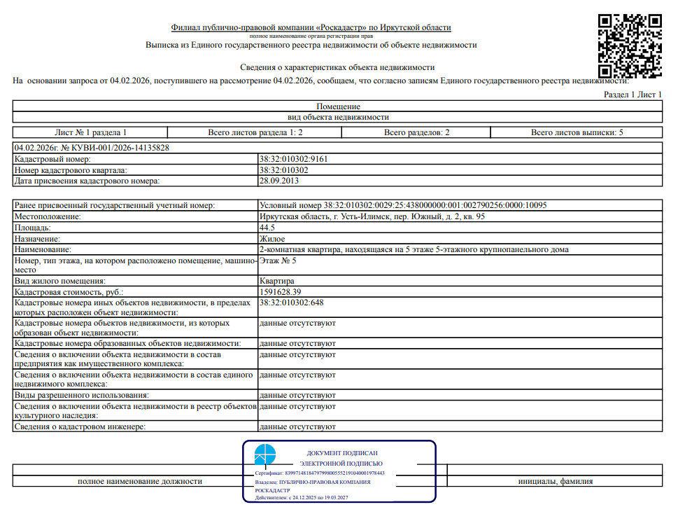 Жилое помещение общей площадью 44,5 кв. м, кадастровый номер 38:32:010302:9161, местоположение: Иркутская обл., г. Усть-Илимск, пер. Южный, д. 2, кв. 95.