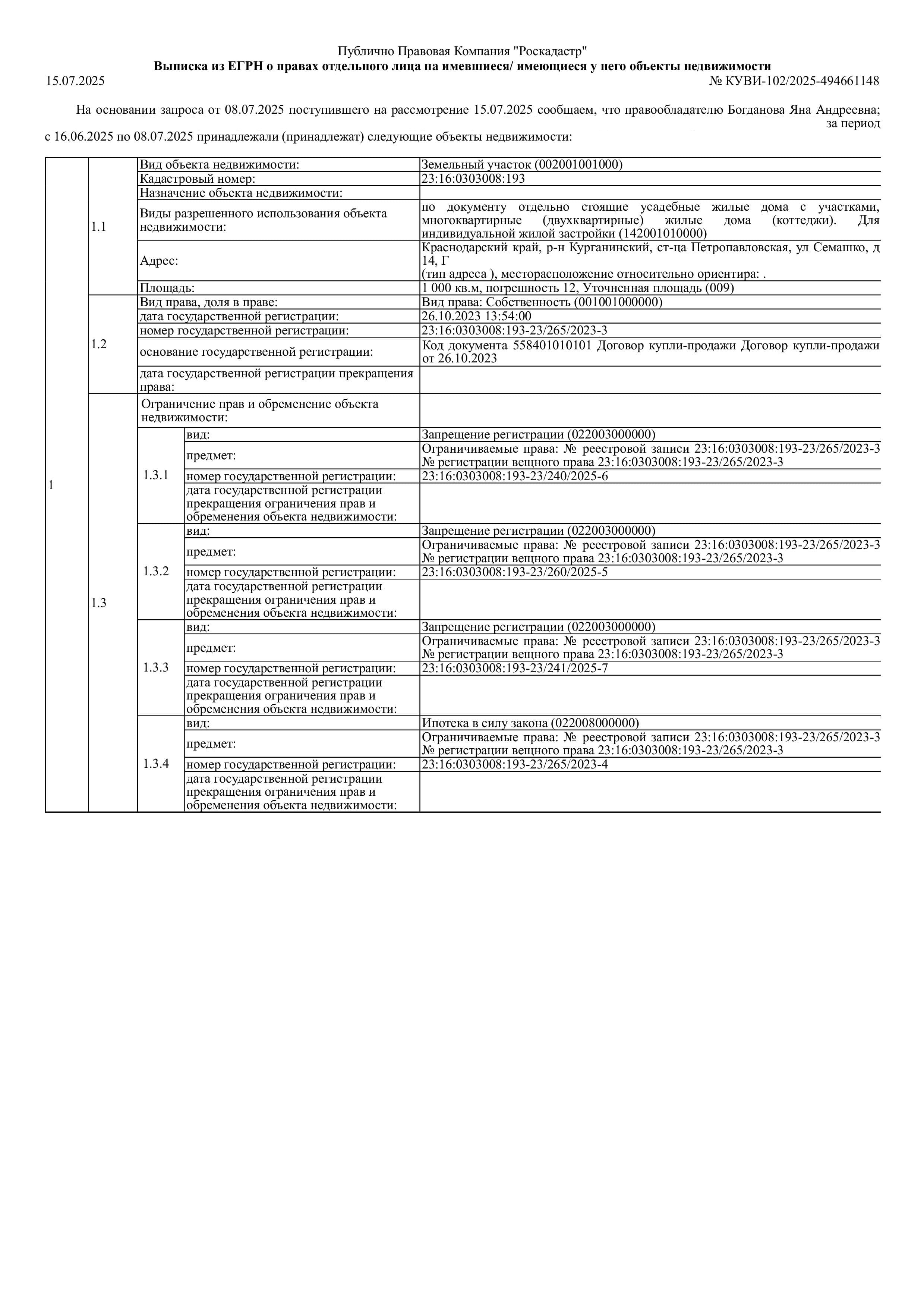 Д-к: Богданова Я.А. Земельный участок (для индивидуальной жилой застройки), площадь 1000 кв.м., кадастровый номер 23:16:0303008:193. Адрес: Краснодарский край, Курганинский район, ст. Петропавловская, ул. Семашко, д. 14 Г. Начальная цена 126 225 руб., задаток 127 руб., шаг аукциона 1 263 руб., ув. 1612