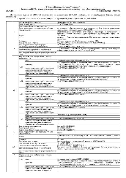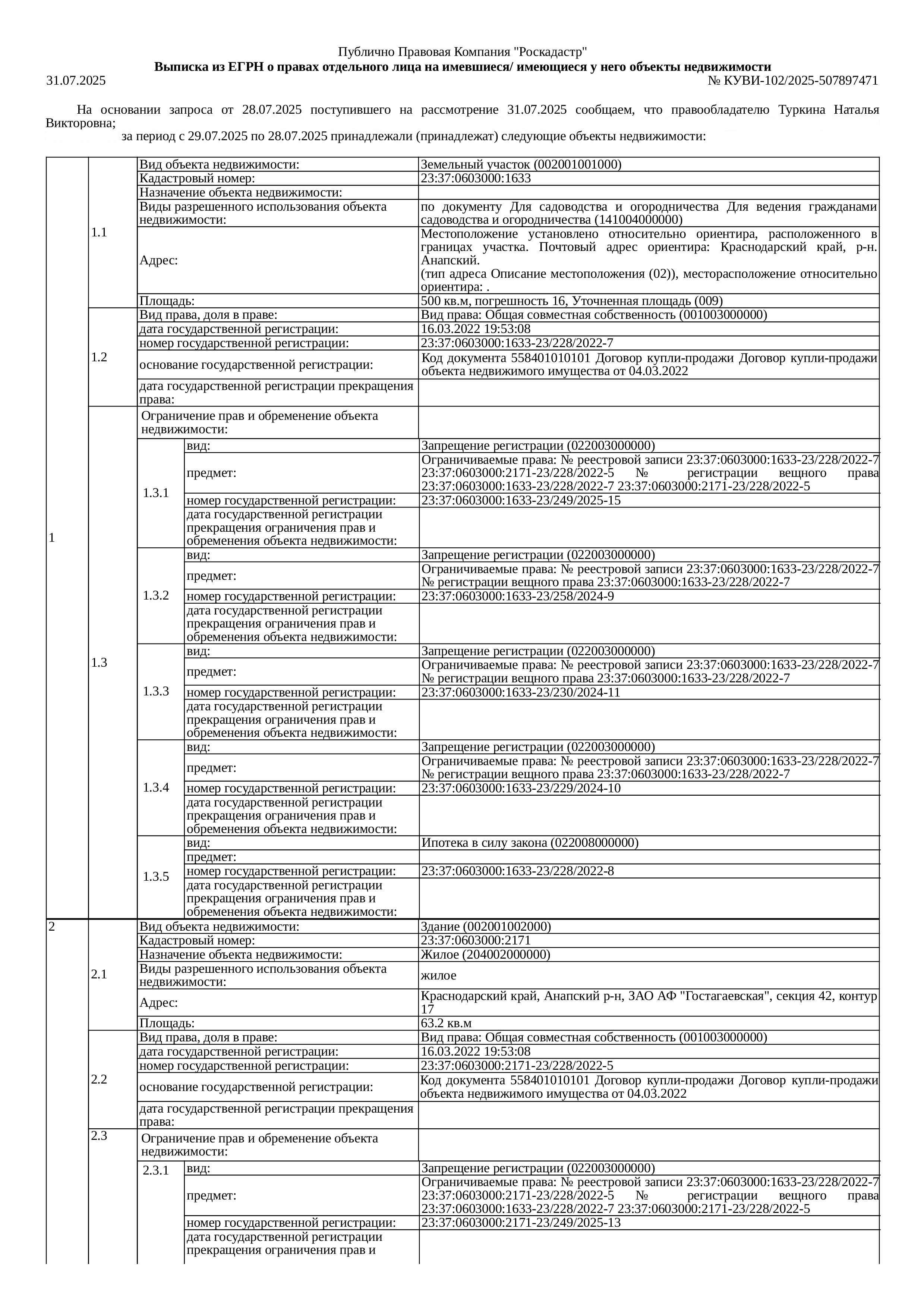 Д-к: Туркина Н.В. Земельный участок (для ведения садоводства и огородничества), площадь 500 кв.м., кадастровый номер 23:37:0603000:1633, жилой дом, площадь 63,2 кв.м., кадастровый номер 23:37:0603000:2171. Вид права собственности - общая совместная собственность Туркиной Н.В. и Туркина Н.А. Адрес: Краснодарский край, Анапский район, ЗАО АФ «Гостагаевская», секция 42, контур 17. Начальная цена 2 016 200 руб., задаток 2 017 руб., шаг аукциона 20 162 руб., ув. 1597