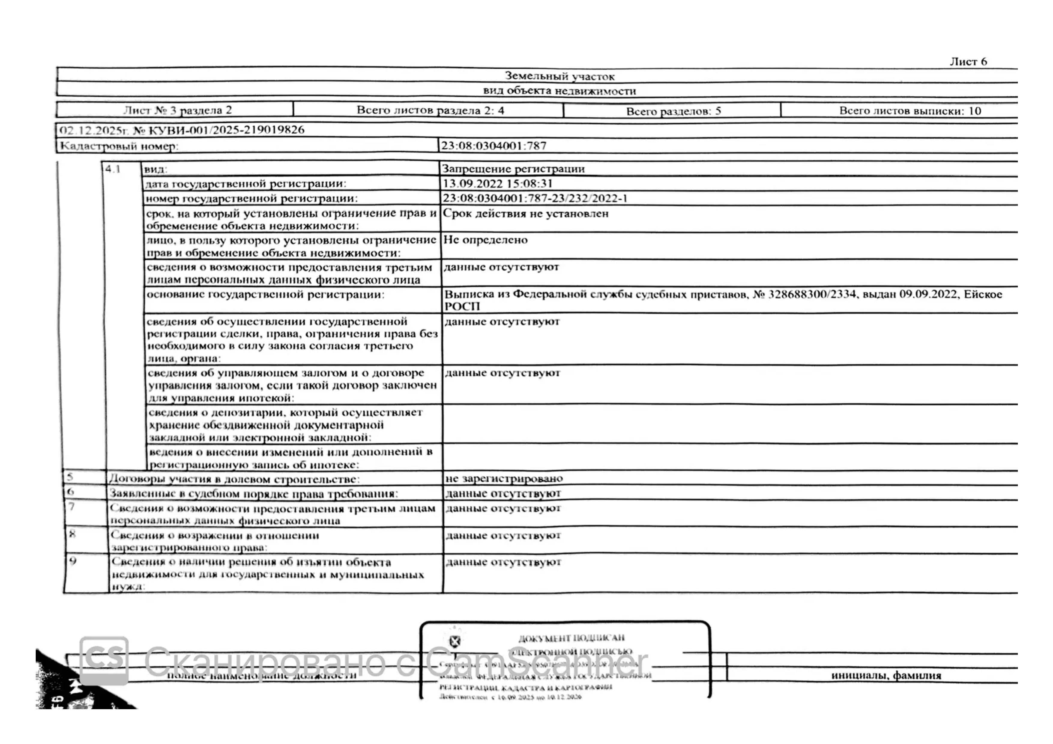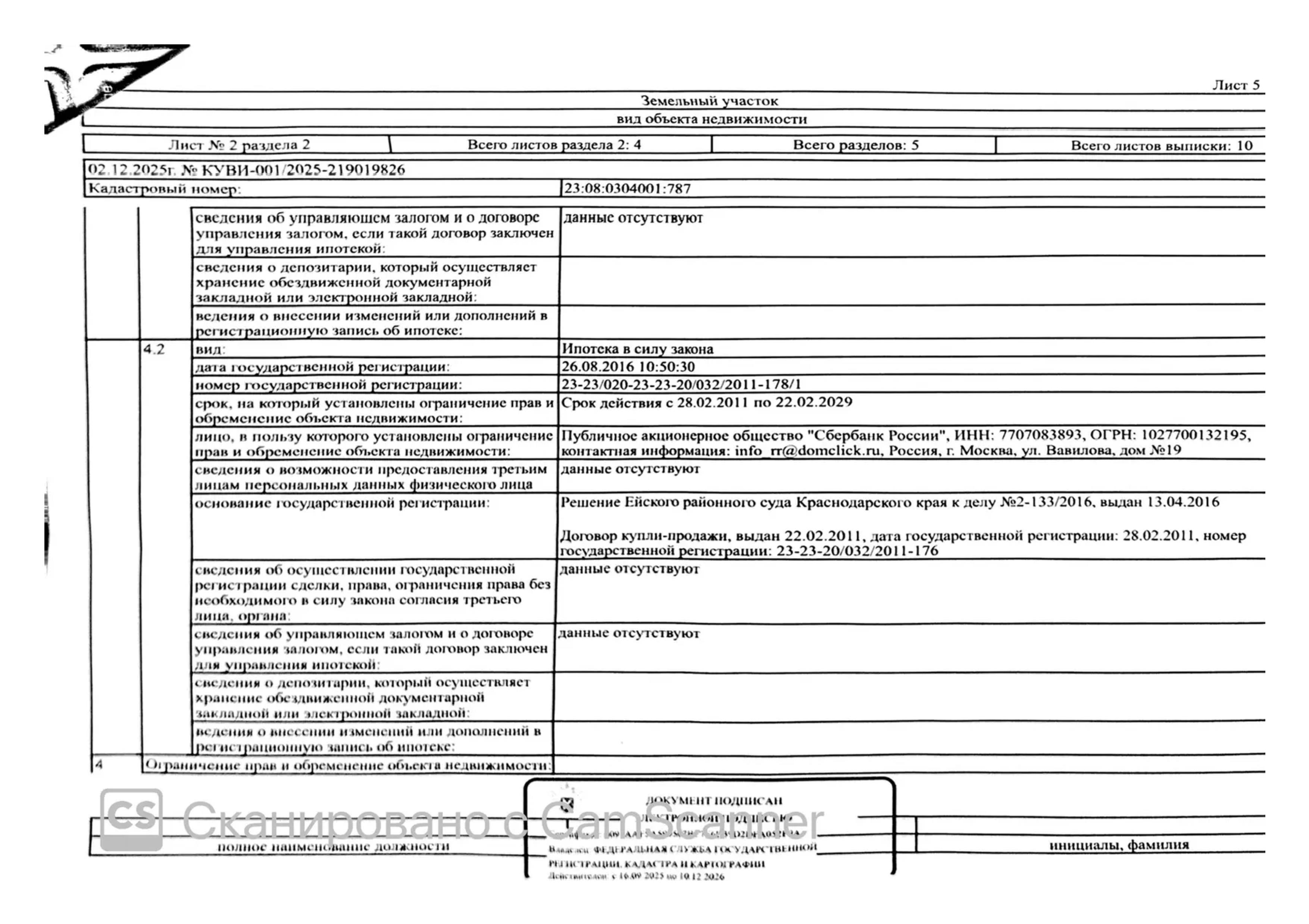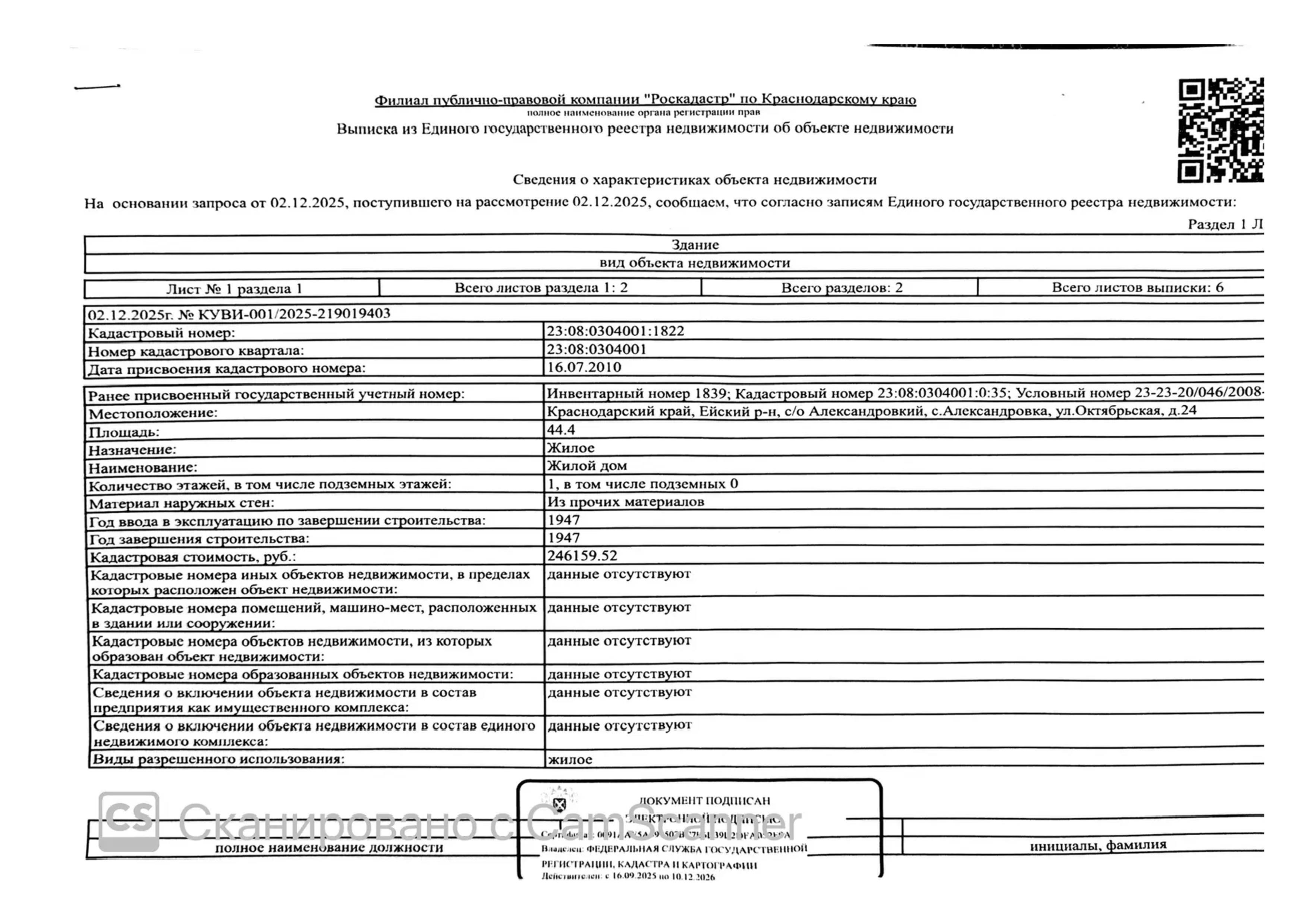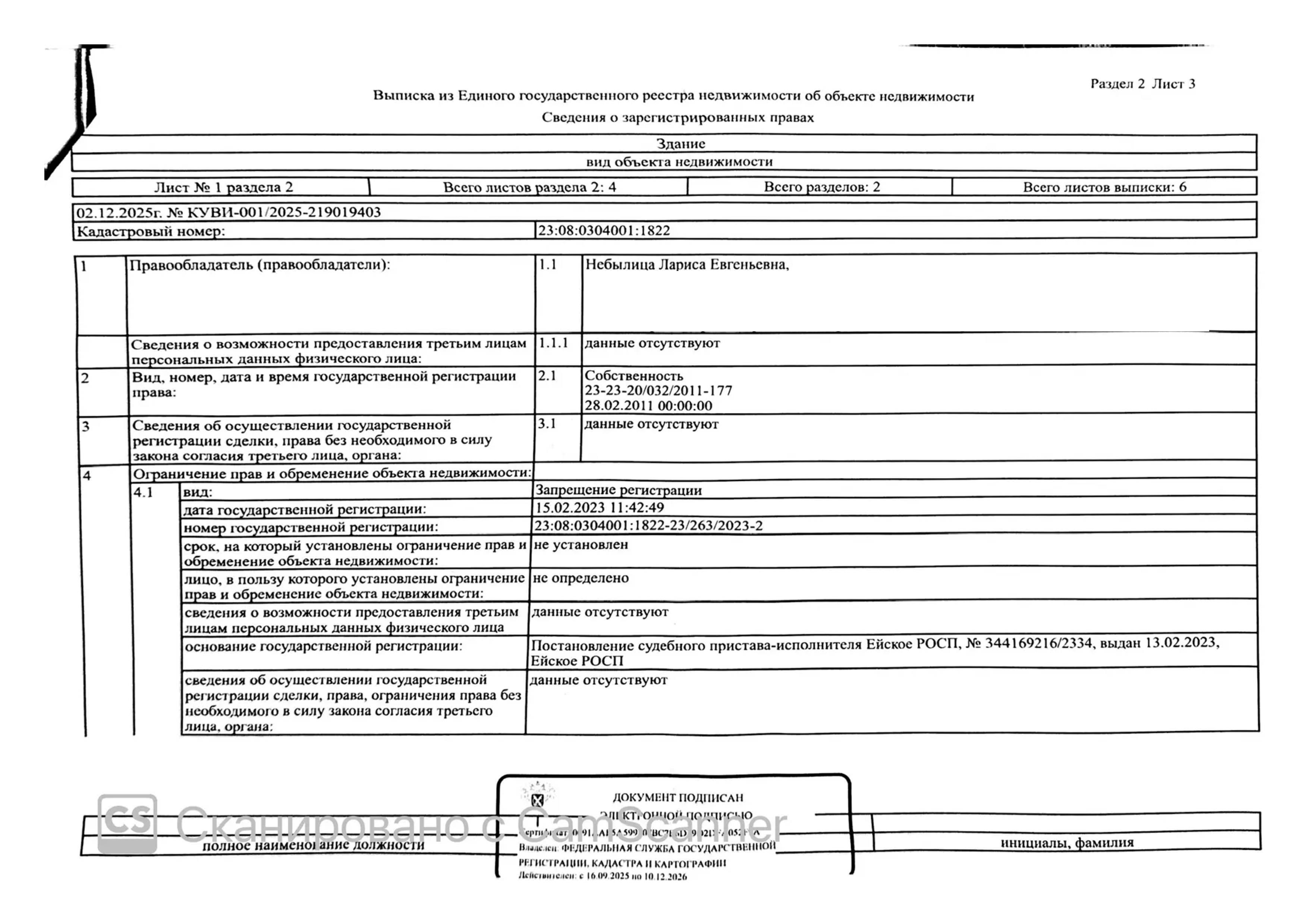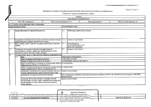 Д-к: Небылица Л.Е. Земельный участок (для индивидуального жилищного строительства), площадь 770+/-19 кв.м., кадастровый номер 23:08:0304001:787, жилой дом, площадь 44,4 кв.м., кадастровый номер 23:08:0304001:1822. Адрес: Краснодарский край, Ейский район, с. Александровка, ул. Октябрьская, 24. Начальная цена 960 000 руб., задаток 960 руб., шаг аукциона 9 600 руб., ув. 1889