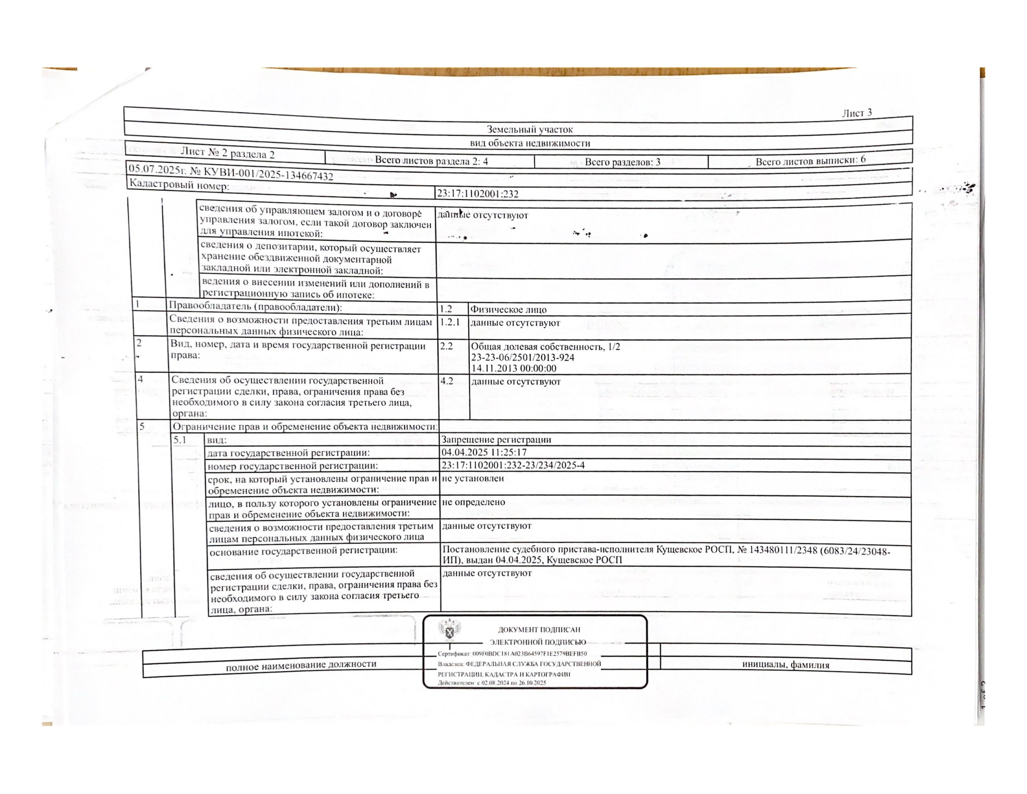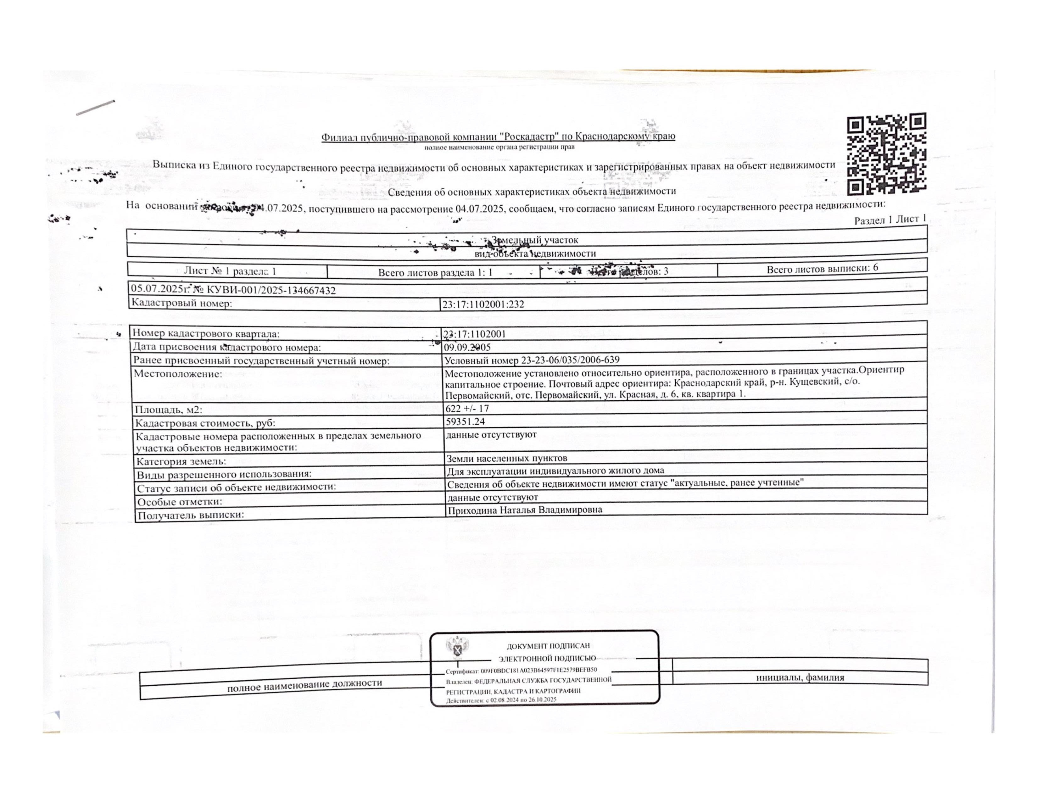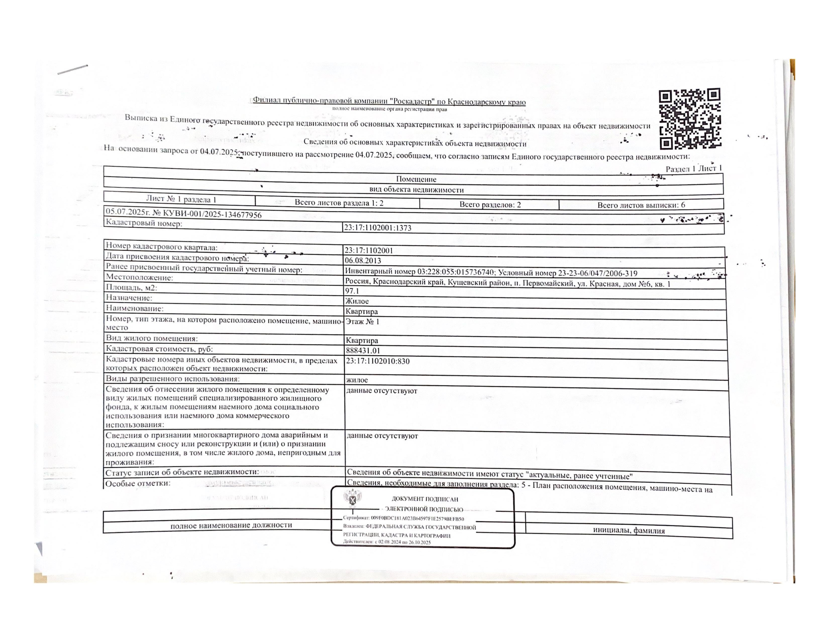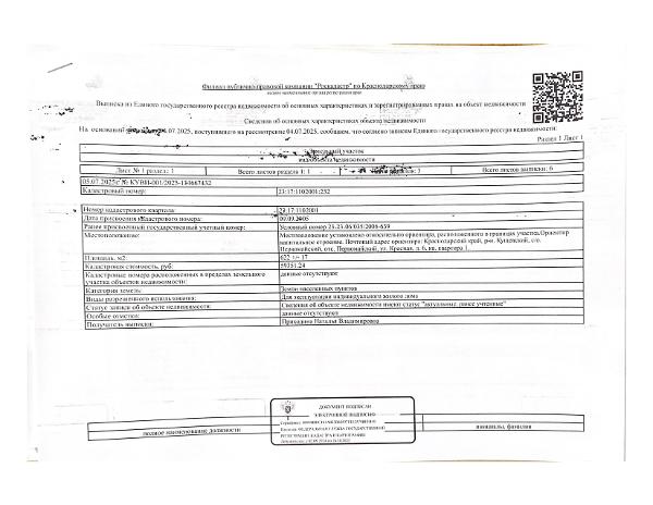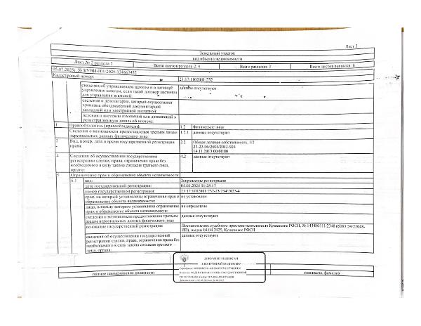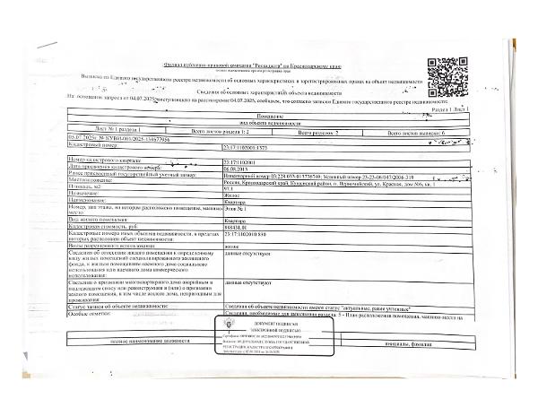Д-к: Войтенко В.С. Квартира, площадь 97,1 кв.м., кадастровый номер 23:17:1102001:1373, земельный участок (для эксплуатации индивидуального жилого дома), площадь 622+/–17 кв.м., кадастровый номер 23:17:1102001:232. Адрес: Краснодарский край, Кущевский район, Первомайский с/о, пос. Первомайский, ул. Красная, д. 6, кв. 1. Начальная цена 1 275 000 руб., задаток 1 275 руб., шаг аукциона 12 750 руб., ув. 1485